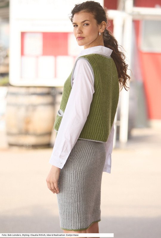 Dieses bezaubernde Set aus kurzer Weste mit Taschen und schmalem Rock wird im Halbpatent gestrickt – dadurch wirkt das klassische Merino-Polyacryl-Mischgarn besonders plastisch. Der dezente Farbkontrast und strukturierte Details wie die eingestrickten Taschen, an denen die Farbe des Rocks dezent hervorblitzt, verleihen dem Look einen modernen Twist. Alle Ränder sind mit einem glatt rechts gestrickten Rollrand versehen. Das breite Rippen-Bündchen am figurbetonten Rock sorgt zudem für einen guten Sitz an der Taille. Eine Anleitung gibts für die Größen 36/38, 40/42 und 44/46.
