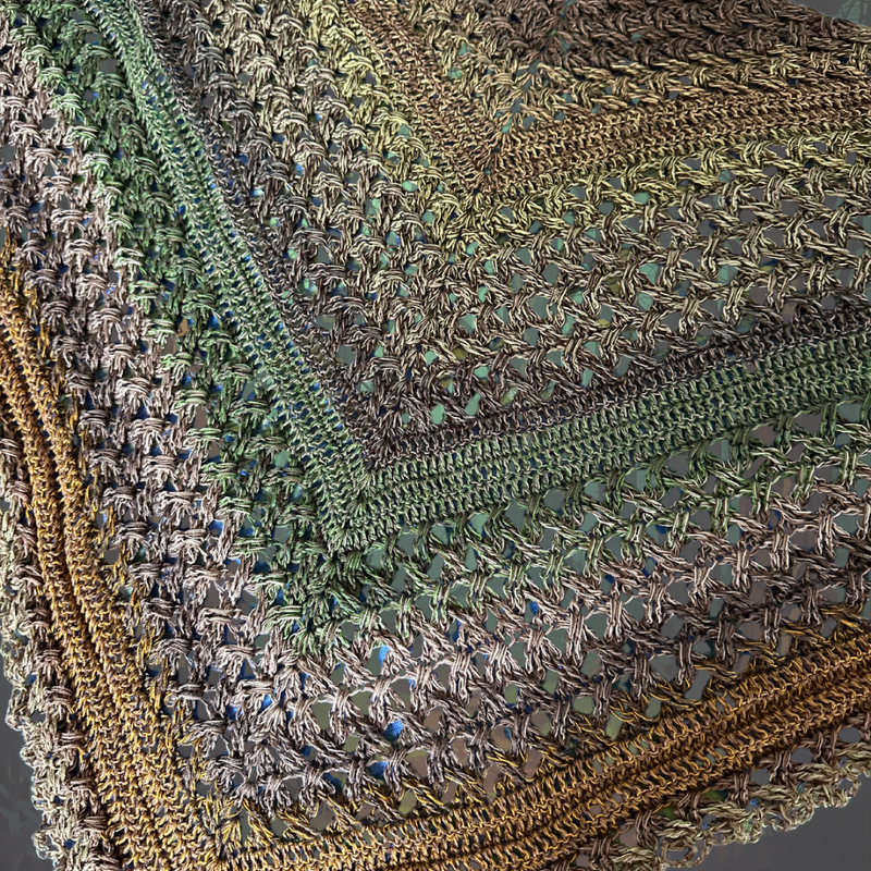 Mein Beispieltuch hat, gehäkelt mit einem 4-fädigen Bobbel (850m) und NS 4,5, eine Spannweite von 1,40m erreicht und eine Tiefe von 0,60m