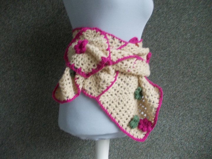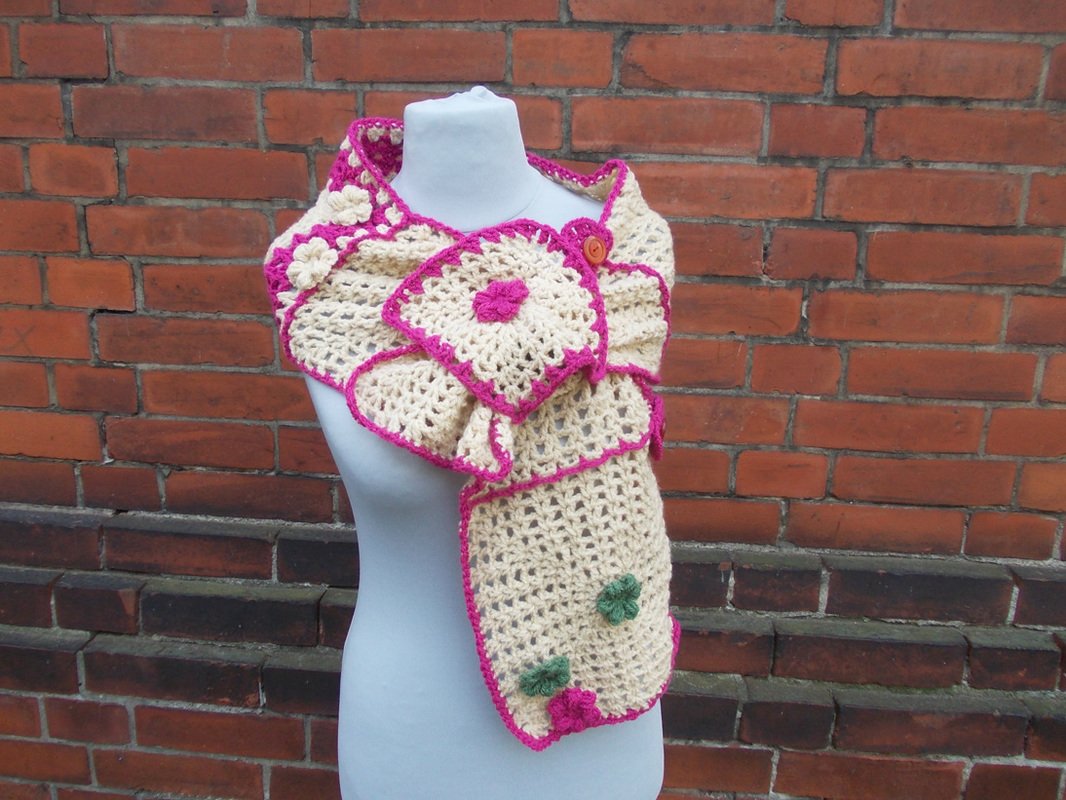 Die 12seitige Anleitung (pdf-Datei 677 KB) enthält Angaben zu Material, Zubehör, Häkeltipps etc. und ist mit über 70 Arbeitsbildern versehen, d. h. Arbeitsschritte der Anleitung für granny square, Schal, Kissenplatte und die Fantasieblume. Schaut Euch die Bilder mit den Tragevarianten an.