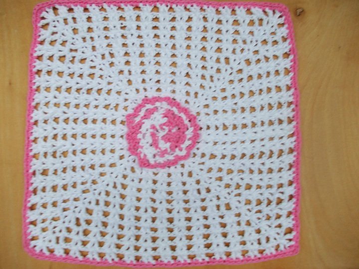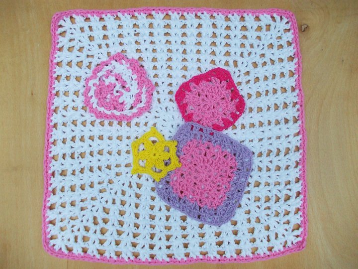 Die auf den Bildern zu sehenden Häkelblumen sind nicht in der Anleitung enthalten. Jedoch enthält die Anleitung die Anleitung für eine Fantasieblume (siehe Bild Kissenplatte weiß in rosa und weiß) .