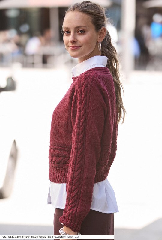 Der quer gestrickte Pullover mit extralangen Ärmeln setzt mit seinen ausdrucksstarken Zöpfen, die horizontal verlaufend eine ganz neue Wirkung entfalten, raffinierte Akzente. Entlang des U-Boot-Ausschnitts gehen die plastischen Zöpfe in geradlinige Rippen über. Rippen gibt es auch an den Ärmelbündchen und dem angestrickten Bund. Der kurze Schnitt (boxy genannt) unterstreicht die Modernität des Modells zusätzlich. Trotz der kürzeren Form gibt der Pulli angenehm warm, was dem reinen Schurwollgarn zu verdanken ist. Eine Anleitung gibt es für die Größen 36/38, 40/42 und 44/46.