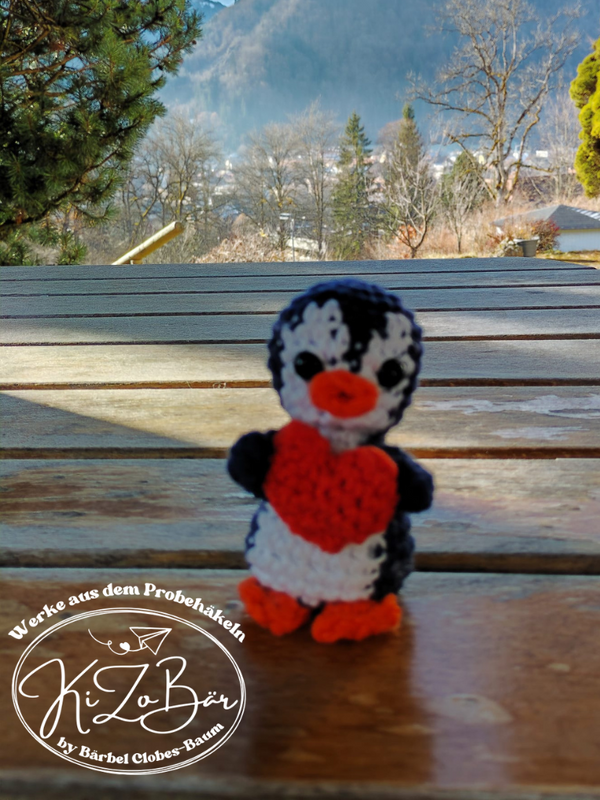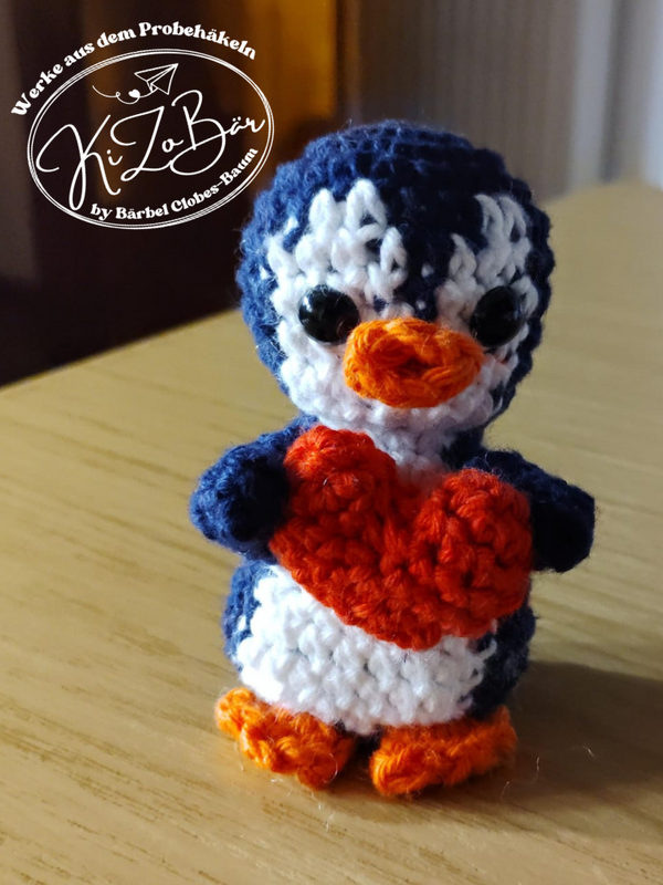 Dies ist kein fertiges Produkt, sondern eine Anleitung zum Nachhäkeln eines herzigen Mini-Pinguin, der mit einem kleinen Herz als Geschenk daher kommt. Es eignet sich als niedliche Deko oder mit Kettchen und Karabiner als Taschenbaumler oder Schlüsselanhänger.