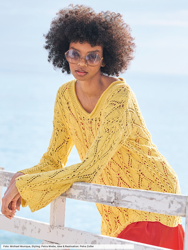 Frühling zum Anziehen! Hier strahlt leuchtendes Gelb mit der Sonne um die Wette und lässt aus leicht schimmerndem Baumwoll-Viskosegarn die extravaganten Musterstrukturen toll zur Geltung kommen. Dafür findest du in unserer Anleitung zwei übersichtliche Strickschriften, die dir die Arbeit erleichtern. Zum Schluss nur noch die vier Teile zusammenähen und die Rollblende am V-Auschnitt nadeln, fertig ist ein Longpulli der Extraklasse.