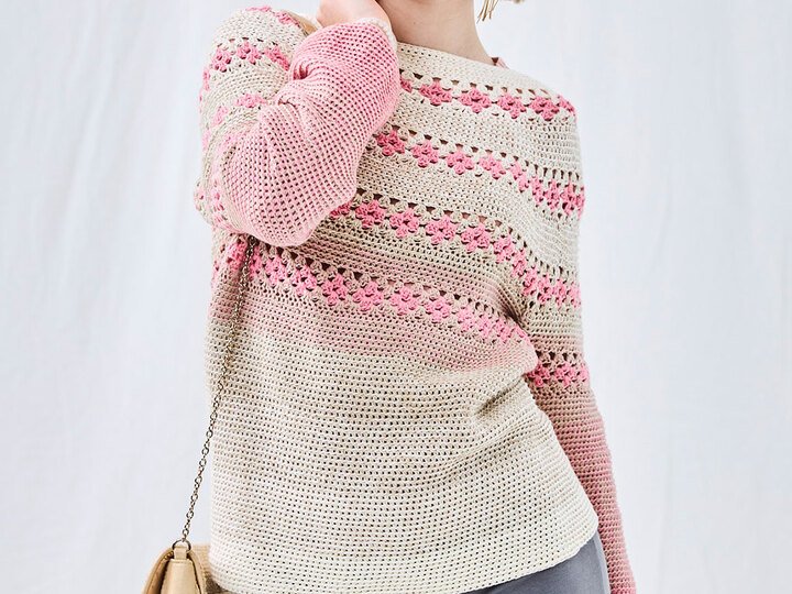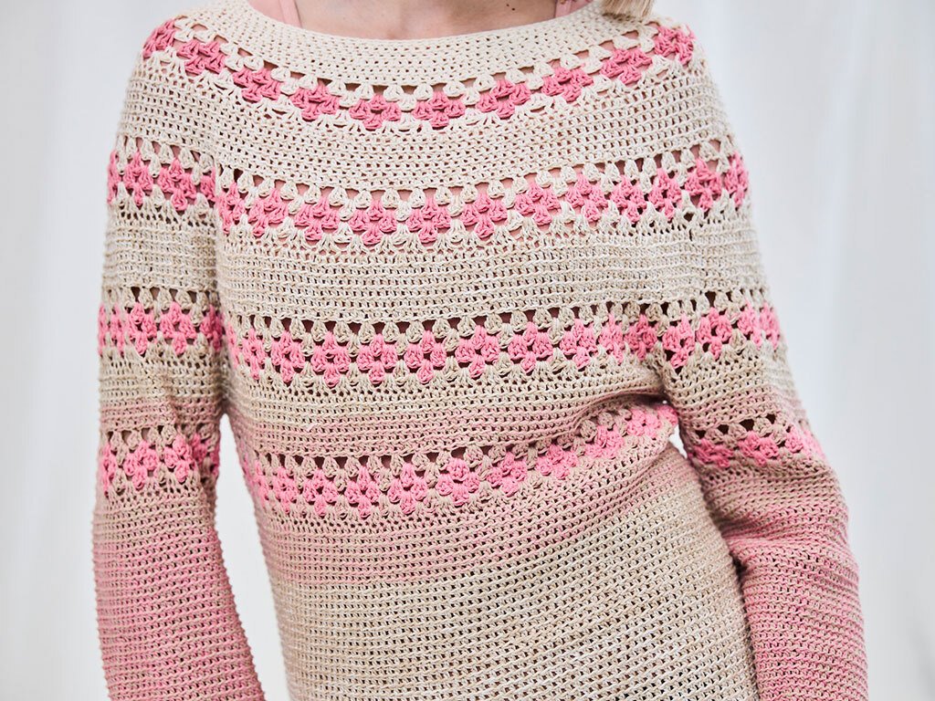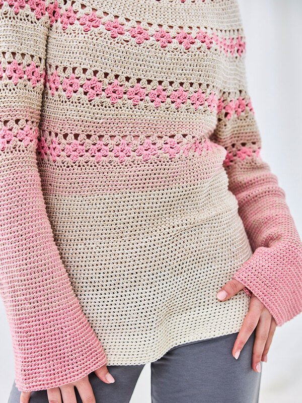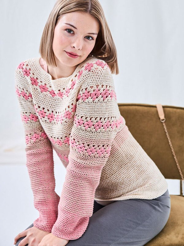 Häkel dir diesen leichten Pullover mit sanften Rosa-Beige-Verläufen und Lochmuster-Akzenten. Perfekt für Frühling und Sommer – luftig, bequem und ein echter Hingucker.Benötigst nur 2–3 Bobbel Woolly Hugs BOBBEL COTTON (50% Baumwolle, 50% Polyacryl, 800 m/200 g), je nach Größe. Der Farbverlauf kommt direkt aus dem Knäuel, kein Fädenwechseln.
