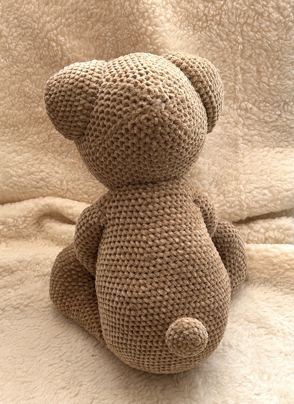 Big Ben wird sitztend ca. 31-35 cm groß, mit Teddygarn sicher noch ein paar cm größer