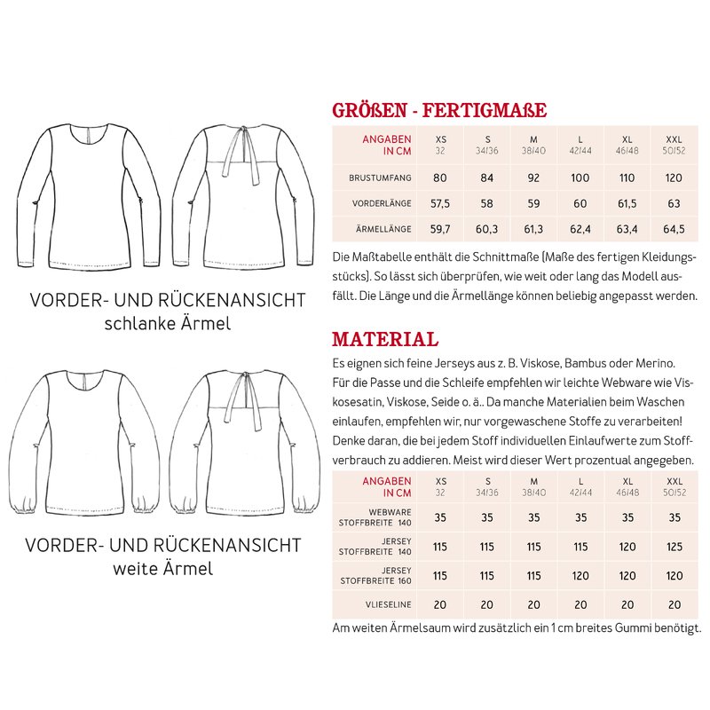 Es eignen sich feine elastische Stoffe wie Jersey aus z. B. Viskose, Bambus oder Merino. Für die Passe und die Schleife empfehlen wir leichte Webware aus zum Beispiel Viskosesatin, Viskose, Seide oder ähnliches.