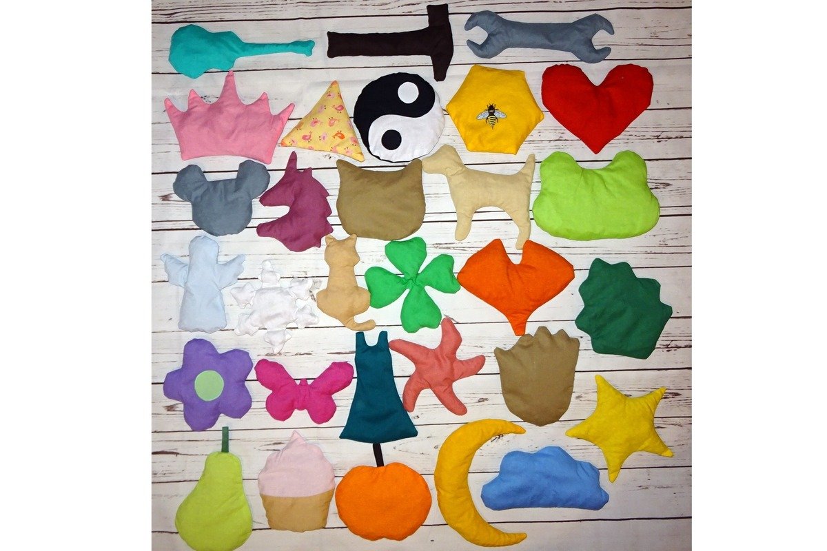 mit Schmetterling, Katze, Kleeblatt, Blume, Birne und Dreieck.