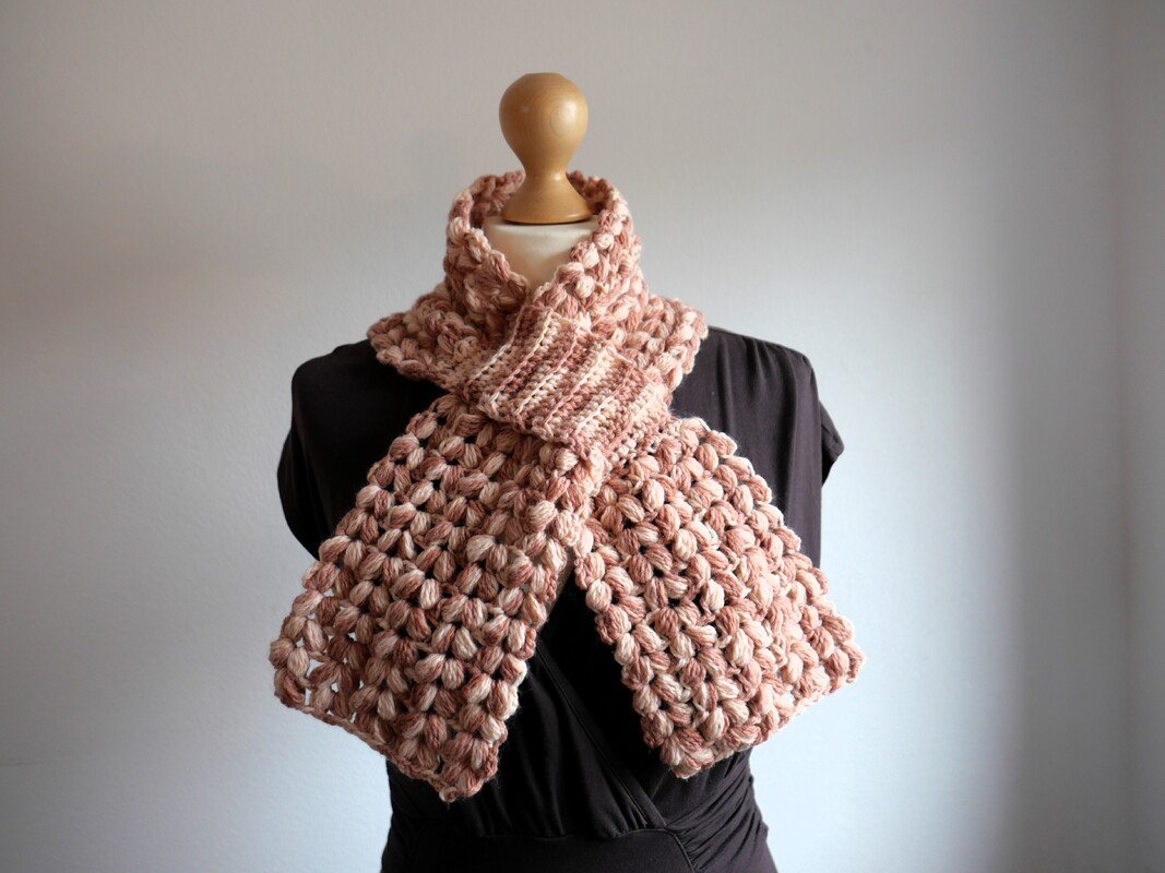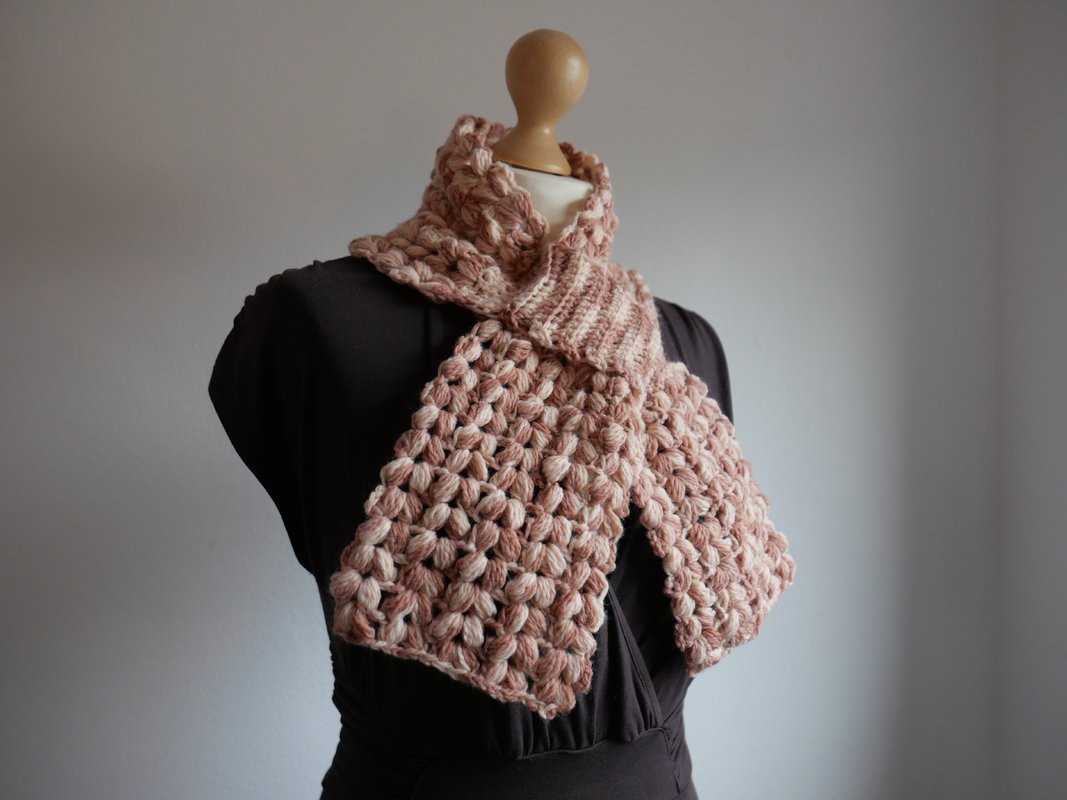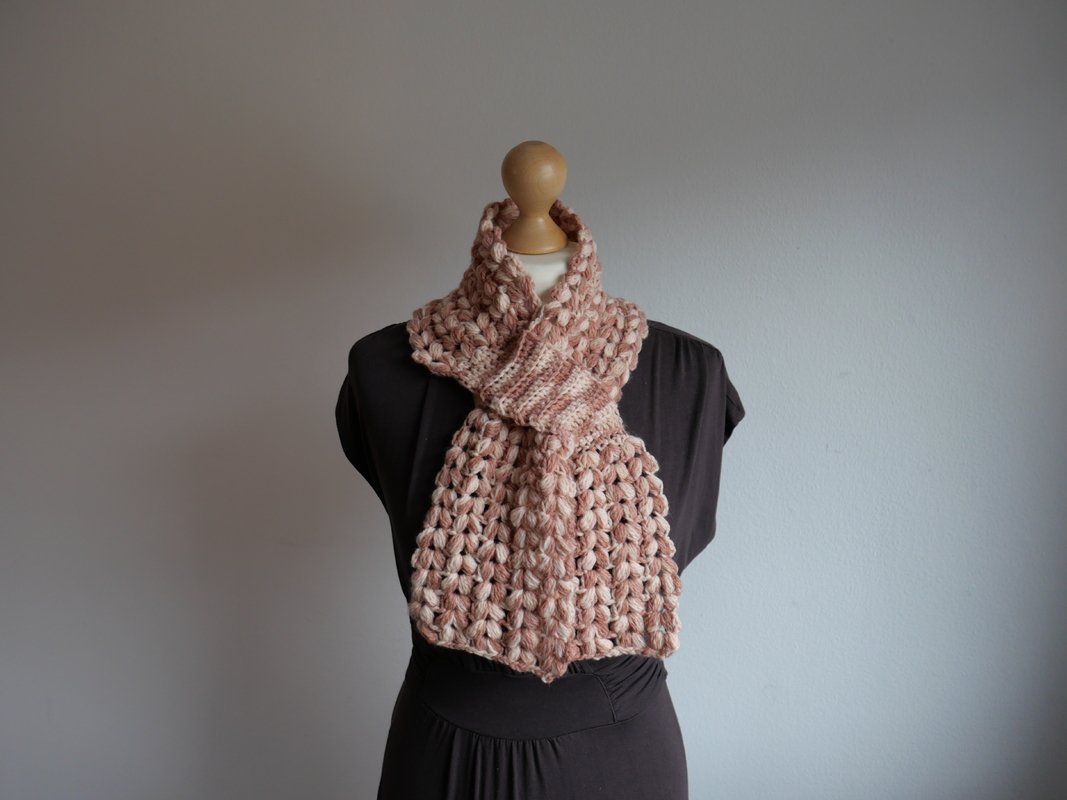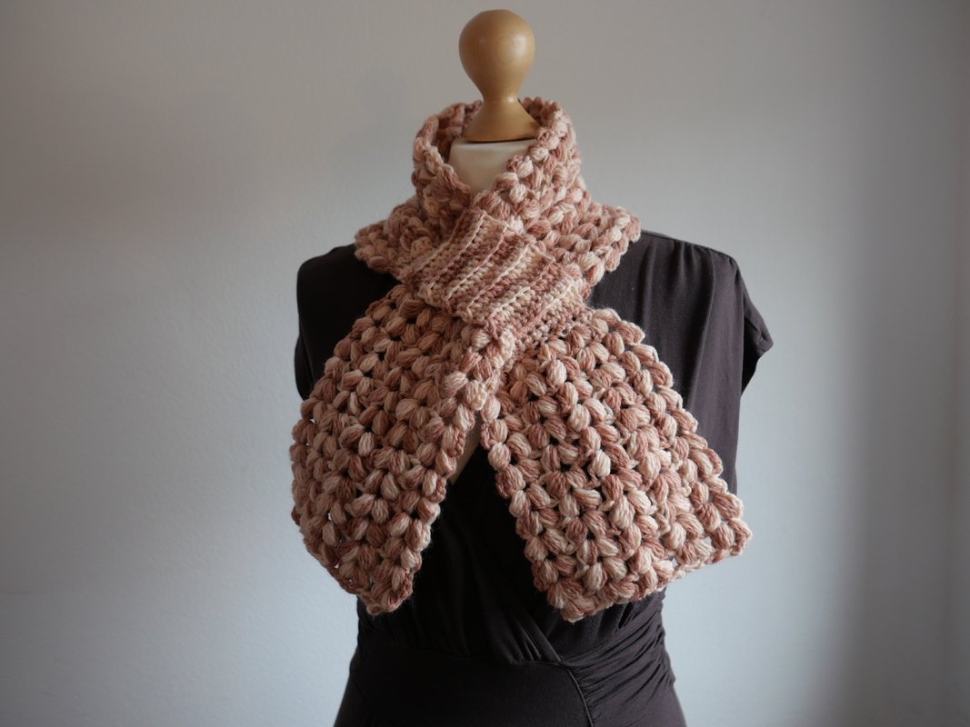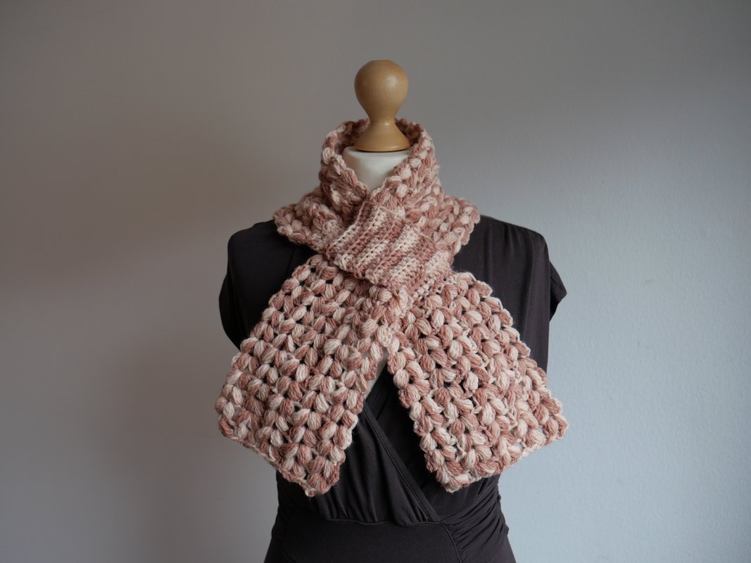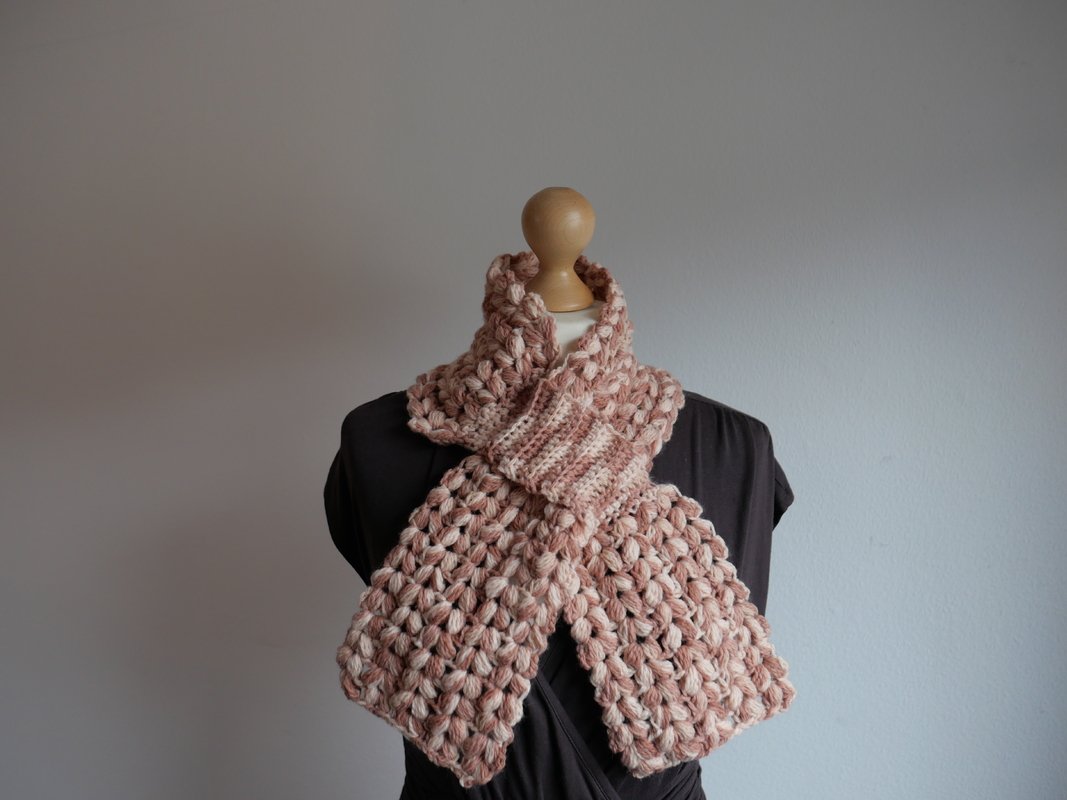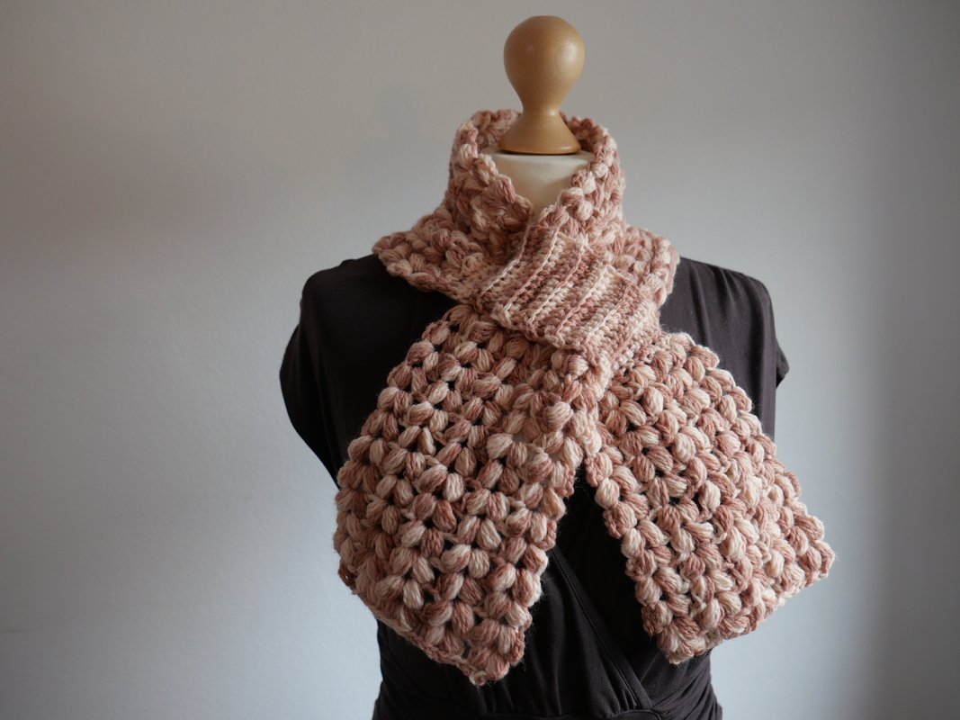 Der Steckschal Grace ist kompakt gearbeitet und überzeugt durch seine plastische Struktur aus Büschelmaschen, die ihm Volumen und eine hochwertige Optik verleiht. Durch die praktische Steckfunktion liegt er nah am Hals an und verrutscht nicht. Die klar geformten Enden fallen weich nach vorne und machen den Schal zu einem echten Blickfang. Das Design wirkt sowohl in melierten Garnen als auch in Uni-Farben besonders ausdrucksstark, da die Struktur im Mittelpunkt steht.
