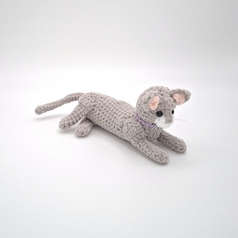 Mit einem dünnen Chenille Garn (50g/130m) und einer Häkelnadel Nr. 2,5 wird die Katze ca. 7 cm hoch und 17 cm lang.