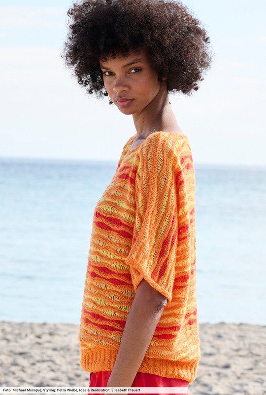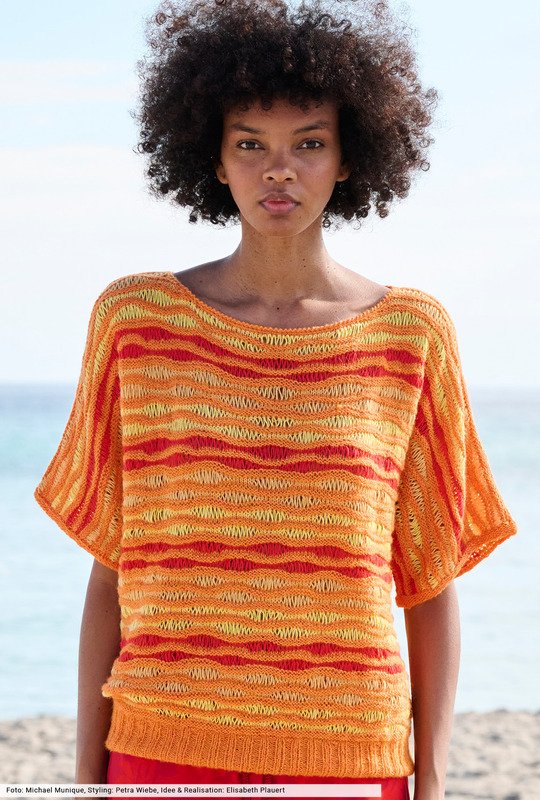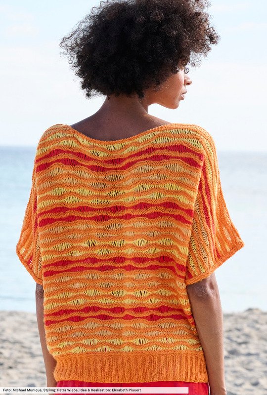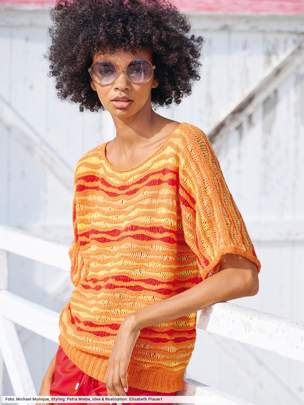 Orange, Rot und Gelb kommen bei diesem Kimonopulli streifenweise in luftigen Wellenstrukturen zum Einsatz. Diese entstehen durch Umschläge, die später fallen gelassen werden. Tipp: Probiere das erstmal an einer Maschenprobe aus, dann geht die Arbeit später wesentlich leichter von der Nadel. Zum Schluss nur noch die Ärmelblenden anstricken, den Halsausschnitt mit einer Kante aus gehäkelten Krebsmaschen versehen und das gute Stück begleitet dich bis weit in den Sommer hinein.