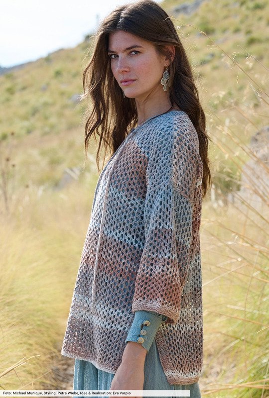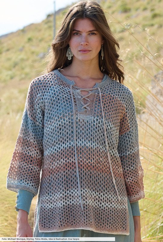 Von Braun über Nougat bis hin zu hellem Denim – bei diesem schönen Farbverlaufsgarn aus Leinen und Baumwolle kann man auf schwierige Muster verzichten. Wir haben uns für ein schlichtes Gittermuster entschieden und daraus einen tollen Longpulli kreiert, der mit einigen Details wie hohen Seitenschlitzen, einem Polo-Ausschnitt und über Kreuz eingefädelten Bindebändern aufwartet. Wir finden: ein tolles Modell, an da sich auch Strickneulinge wagen können.