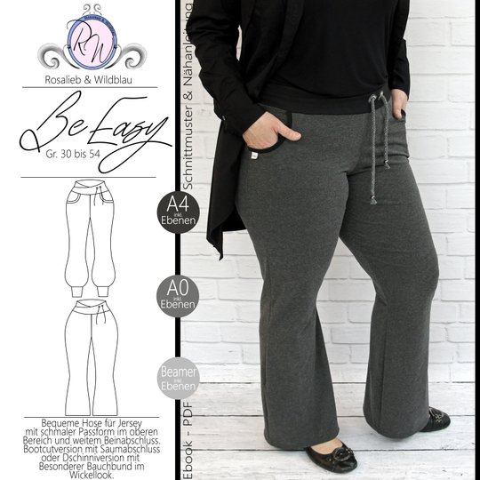 Das Schnittmuster BeEasy ist eine entspannte Jerseyhose mit tollen Details. Sie ist sowohl für Zuhause geeignet als auch für unterwegs. Ihre Passform ist obenherum körpernah und endet am Bein weit. Der weite Abschluss beginnt auf Kniehöhe. Dort findest du im Schnittmuster einen Bootcutabschluss und einen Dschinniabschluss mit Bündchen. Beide Abschlüsse sorgen jeweils für einen total unterschiedlichen Look. Beide Möglichkeiten haben gemeinsam, dass sie zusätzlich mit Hosentaschen und einem Bauchbund im Wickellook genäht werden können. Der Wickellook des Bauchbundes ist nicht zu extrem, sodass der Bauch nicht zu sehr freigegeben wird.Ein kleines Highlight sind Ösen, die schräg am Bund platziert sind. Sie erfüllen keinen praktischen Zweck, sind jedoch eine tolle Zierde, falls du deine Hose noch einmal besonders gestalten möchtest.