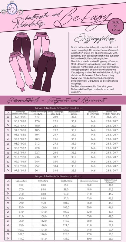 Das Schnittmuster ist in Größe 30 bis 54 gradiert, auf eine Körpergröße von 1,64m-1,65m ausgelegt und enthält eine Naht- und Saumzugabe (0,7cm & 2cm) auf jeweils einer extra angelegten Ebene. So kannst du entscheiden, ob du den Schnitt nur mit der Nahtlinie nutzt oder dir zusätzlich die Zugaben einblenden möchtest. In den Dateien findest du die A4-Versionen zum Ausdrucken, eine A0-Datei (2 Seiten) sowie die Beamerdatei - alle Versionen inkl. Ebenen zum Ein- und Ausblenden der Größen. BeEasy ist auf Jersey ausgelegt.