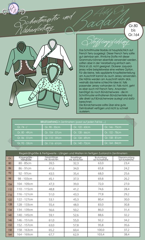 Das Schnittmuster ist in Echtgröße (du nähst hier nach echter Körpergröße) gradiert und enthält eine Version ohne Zugaben und eine Version mit den Einzelteilungen inkl. Zugaben (0,7cm Nahtzugabe) und Nahtlinie. Es umfasst die Größen 80 bis 164 und ist damit für eine Körpergröße zwischen 80 und 169 cm geeignet. In den Dateien findest du die A4-Versionen zum Ausdrucken, eine A0-Datei (Großdruck) sowie die Beamerdatei - alle Versionen inkl. Ebenen zum Ein- und Ausblenden der Größen und wie bereits erwähnt je in einer eigenen Version mit oder ohne Zugaben. Badalu ist hauptsächlich auf French Terry ausgelegt und je nach Version für Fortgeschrittene aber auch Anfänger geeignet.
