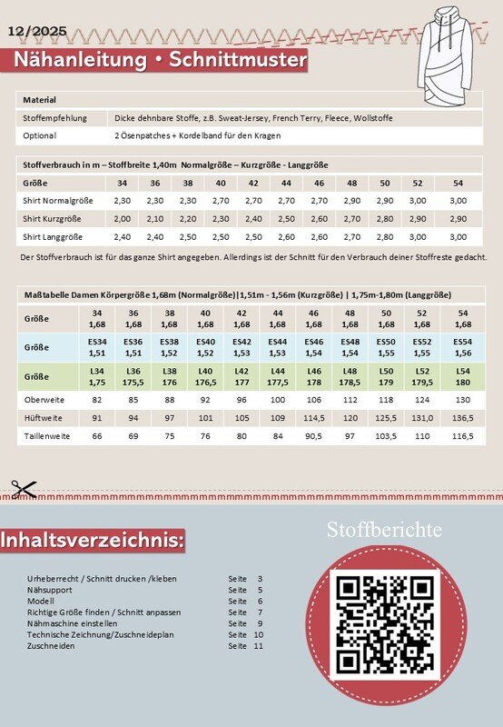 Durch den legeren Sitz und die Länge bis zur Mitte des Oberschenkels ist Lani perfekt für den Alltag – bequem zu Jeans, Leggings oder schmalen Hosen. Ein gemütlicher Stehkragen (optional mit Ösenpatches und Fake-Kordel) rundet den Look ab. Kurze Videosequenzen in der Anleitung unterstützen dich Schritt für Schritt – ideal, wenn du zwischendurch nur kleine Näh-Zeitfenster hast. ️