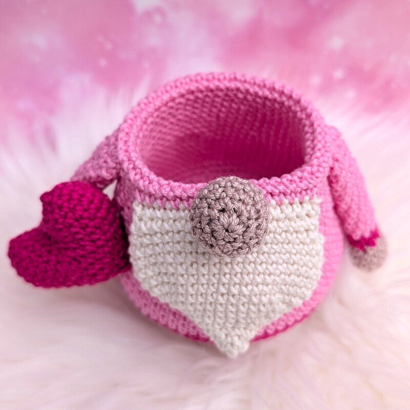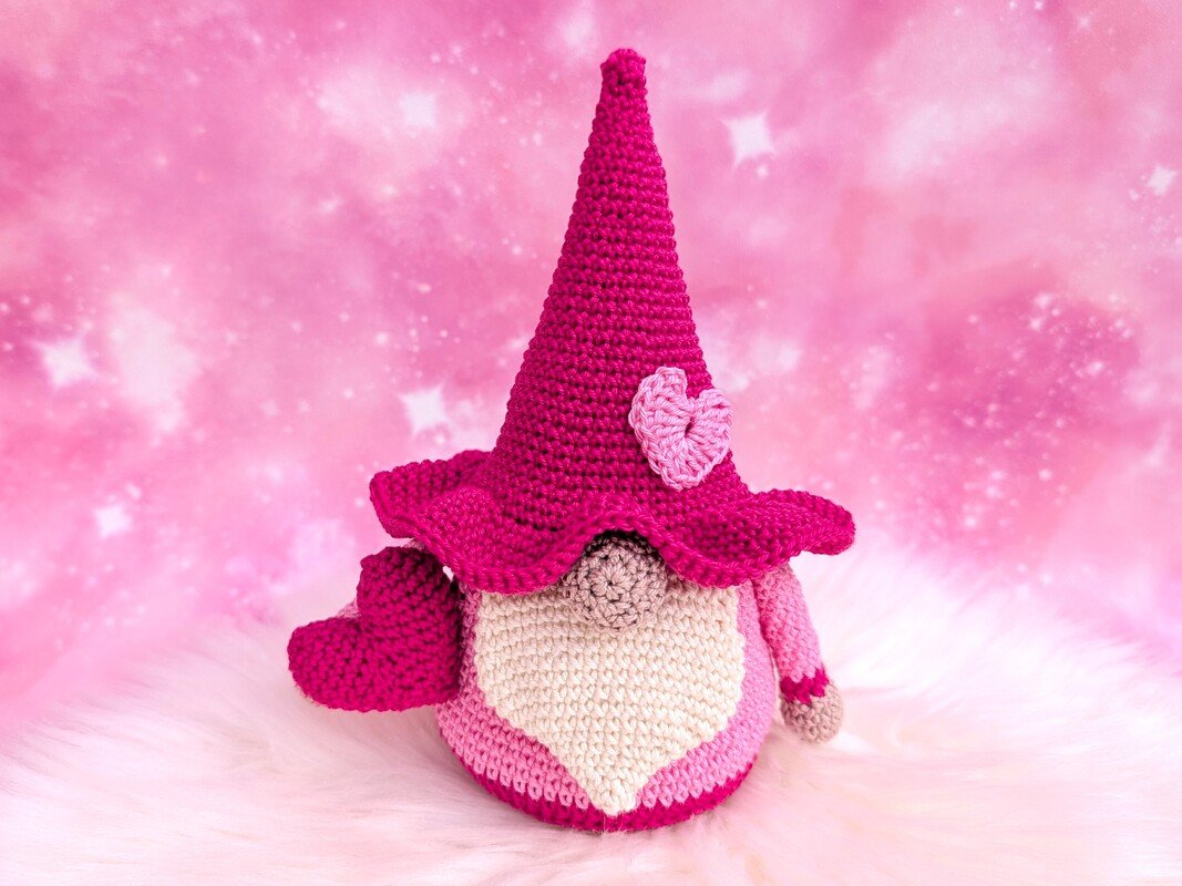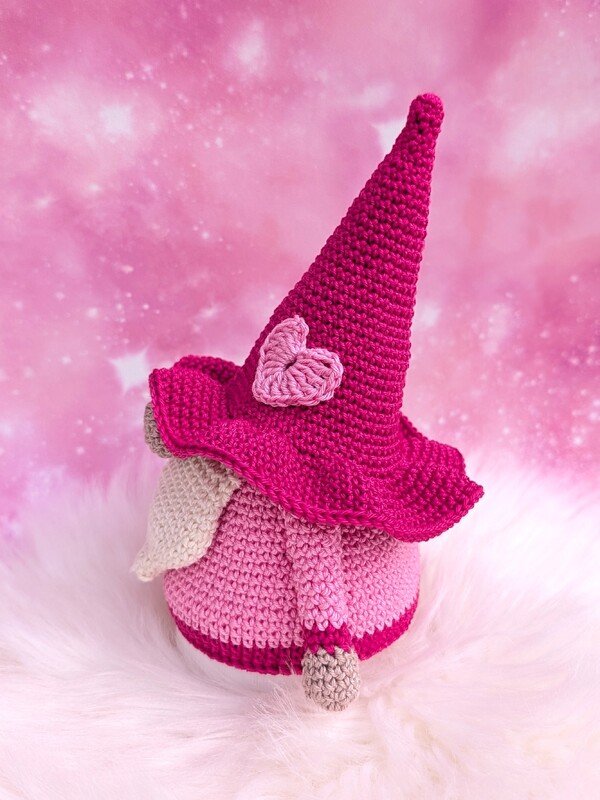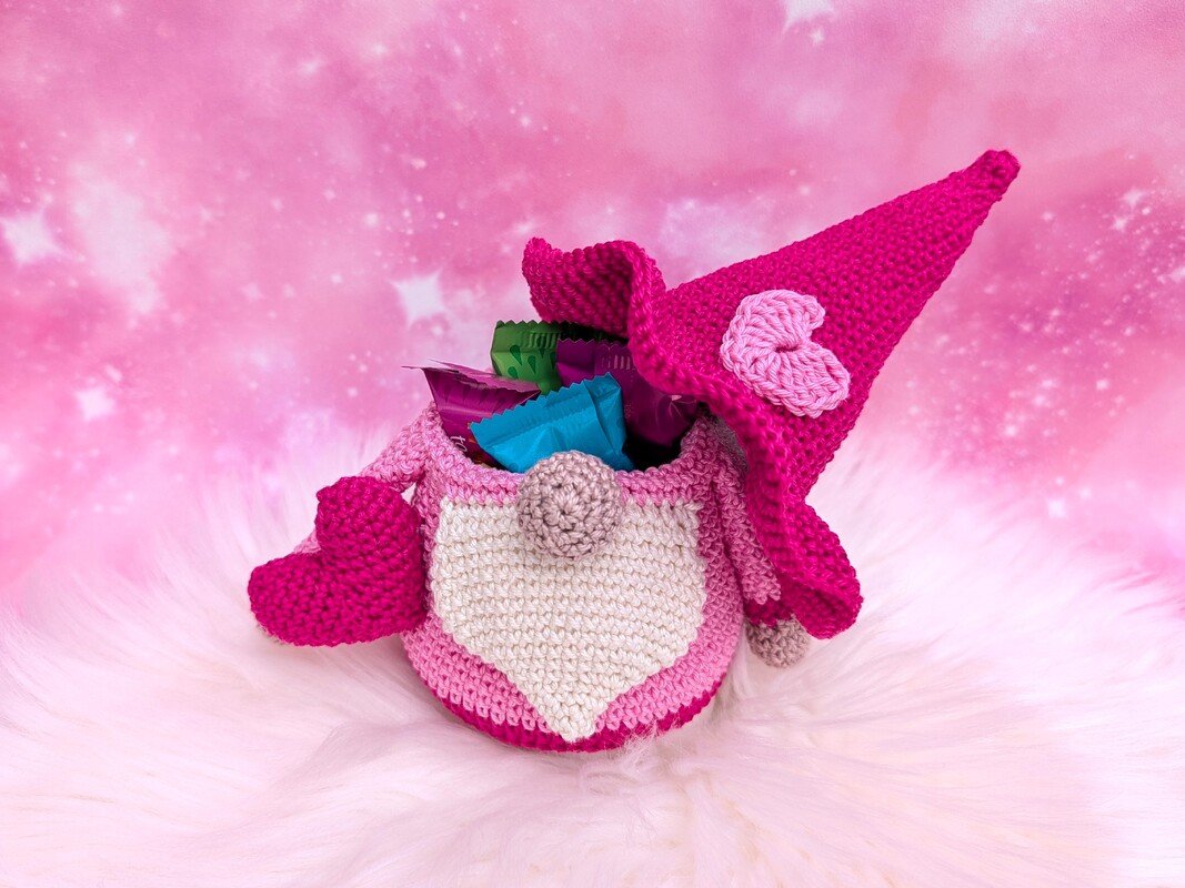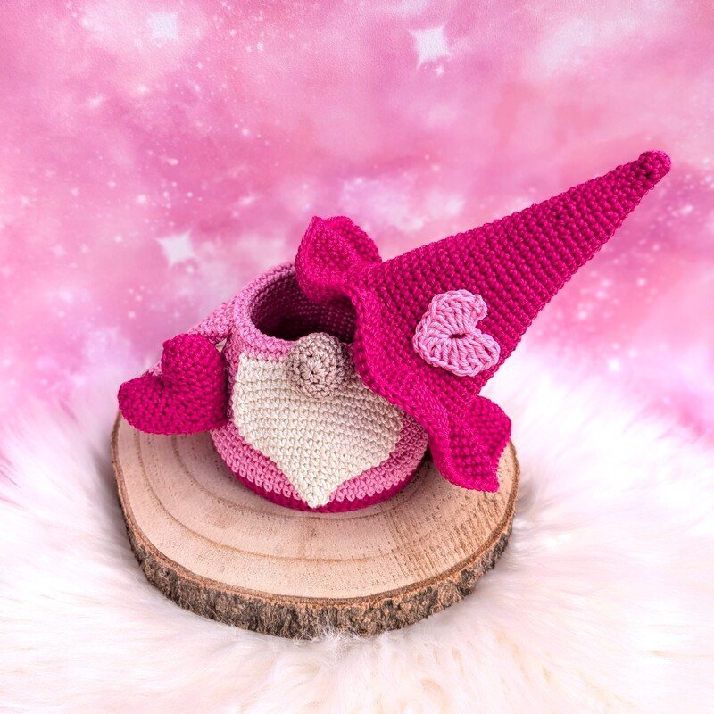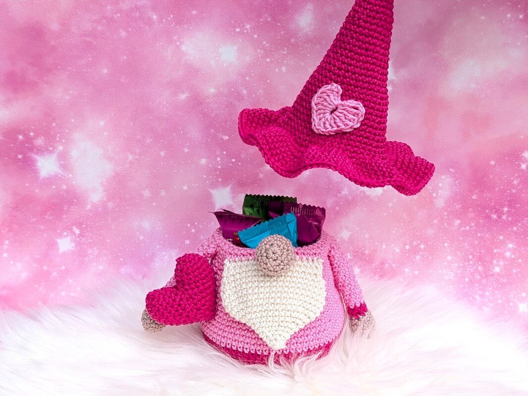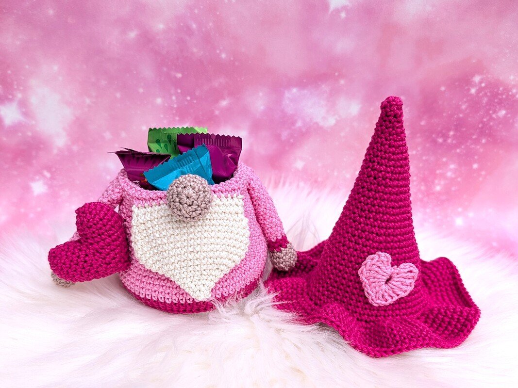Diesen tollen Wichtel kannst du mit süßen Nascherein füllen oder als Schmuckkästchen verwenden. Eine tolle Geschenkidee für den Valentinstag oder Muttertag. Falls du den Körper lieber als geschlossene Figur häkeln möchtest, so ist auch hierfür eine Erklärung enthalten. In dem Fall wird der Körper ausgestopft und der Hut am Schluss entlang einer vorgegebenen Linie festgenäht.