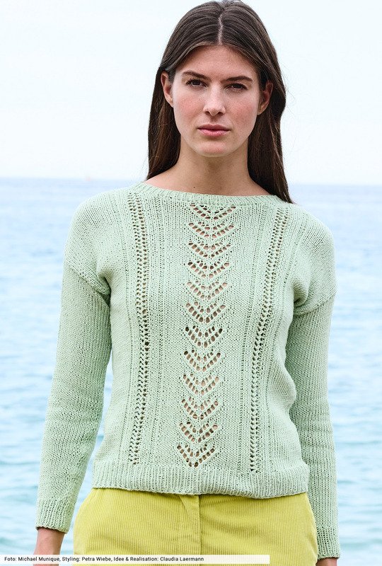 Nachhaltig und stylish zugleich: Der mintgrüne Pulli aus Bamwolle, die teilweise recycelt ist, wird höchsten Ansprüchen gerecht. Einerseits ist es das Design aus Ajour- und Lochmusterstreifen, das bei hohen Temperaturen viel Luft an die Haut lässt. Andererseits überzeugt er durch den Schnitt, der an den Seiten- und Schulterkanten eine leichte Schrägung aufweist und dadurch für die perfekte Passform sorgt.