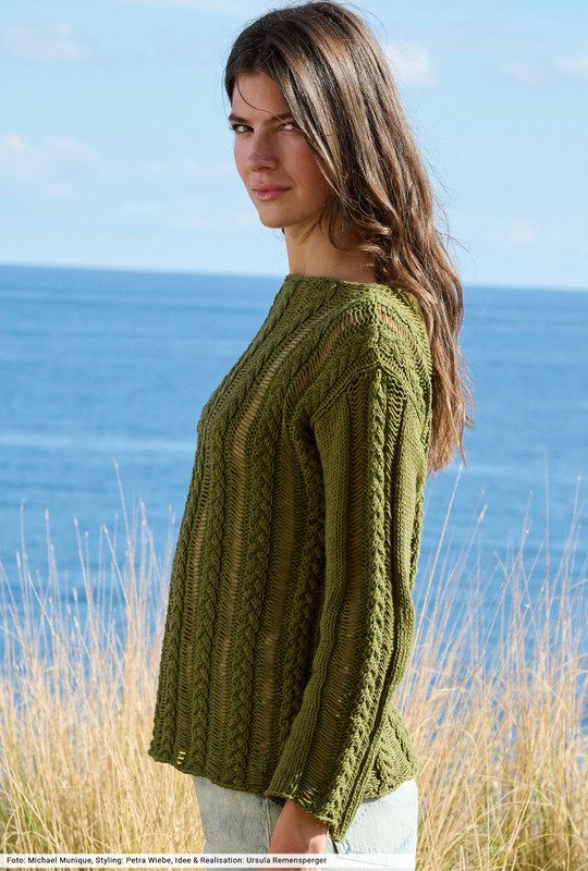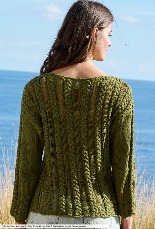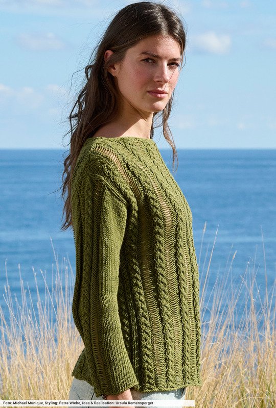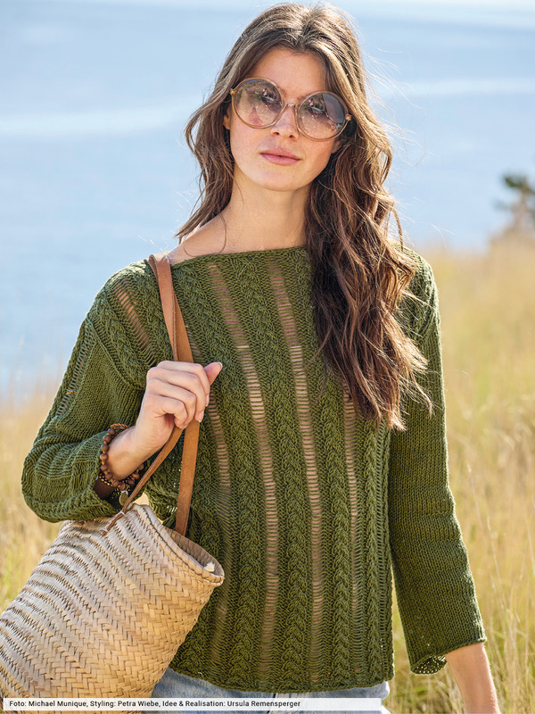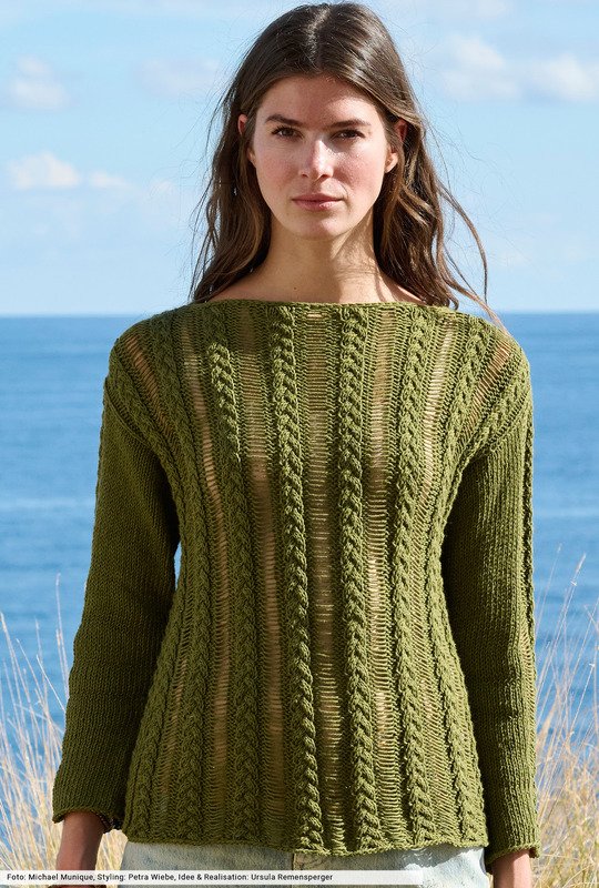 Natürlich Töne und lässige Silhouetten erzählen von einem neuen Strickgefühl, in dem man vollkommen ungezwungen den Frühling genießen kann. Hier mit einem gerade geschnittenen Baumwoll-Leinenpulli, bei dem zwischen schmalen Zopfstreifen Maschen fallen gelassen werden. Ein toller Effekt, der gleichzeitig viel Luft an die Haut lässt. Info: Wir haben bei diesem Pulli komplett auf Bündchen verzichtet, dafür schmückt eine dezente I-Cord-Blende den Halsausschnitt.