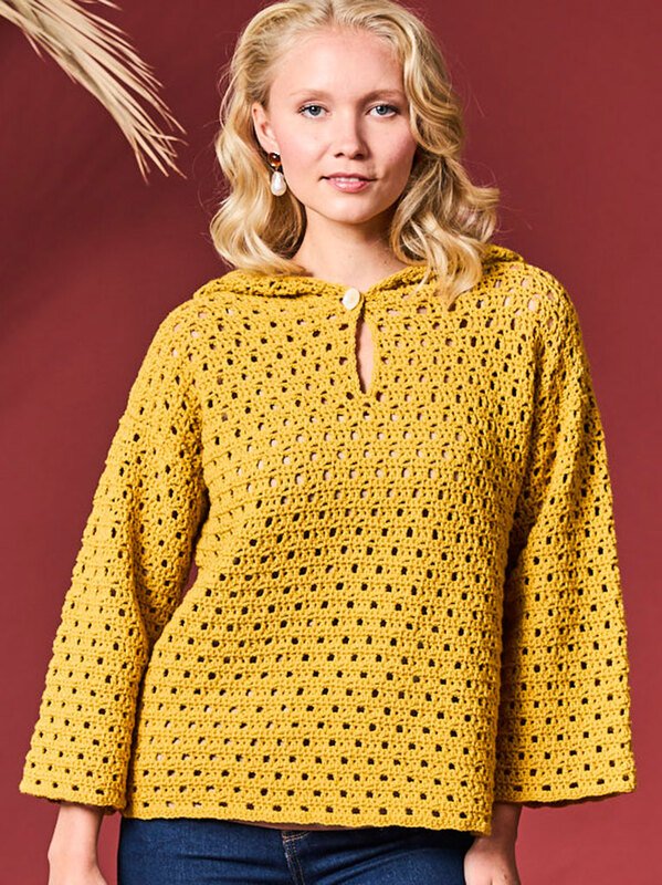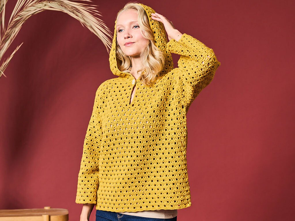 Häkel dir diesen sonnigen Kapuzen-Hoodie in strahlendem Gelb – oversized mit großer Kapuze, weiten Ärmeln und schönem luftigen Muster. Luftig, lässig und perfekt für den Übergang.