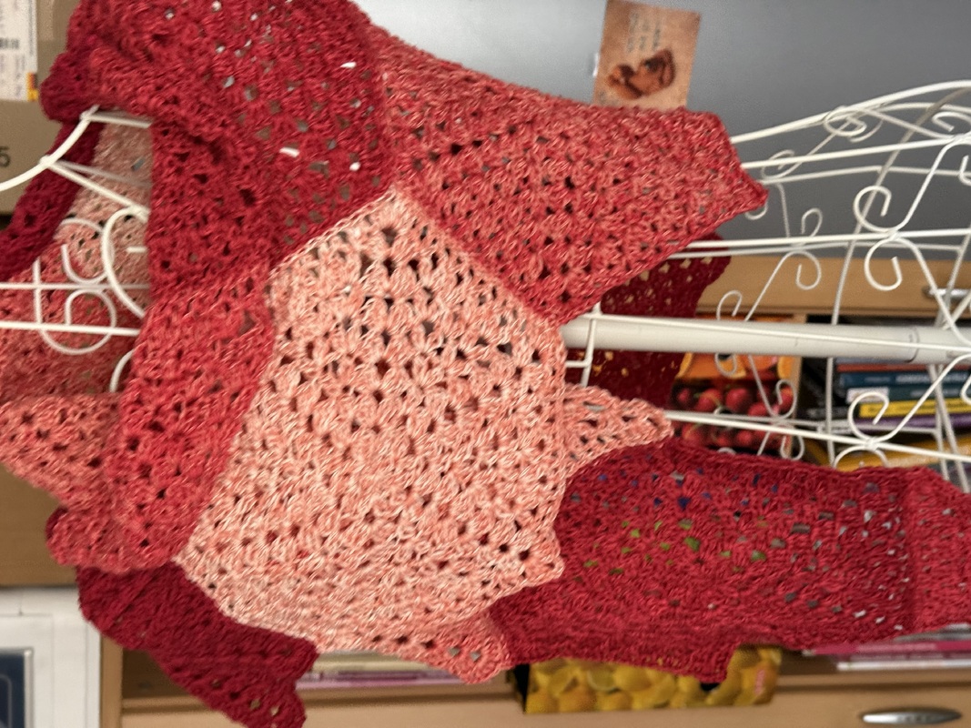 10 ganze und 5 halbe Hexagone mit einem schönen Lochmuster und mega Farbverlauf der Woolly Hugs BOBBEL COTTON (gehäkelt) oder mit der Woolly Hugs YEAR SOCKS (gestrickt) von tiefem Burgunder über Magenta bis zartem Rosa. Kuschelig weich, super bequem und ein absoluter Hingucker.