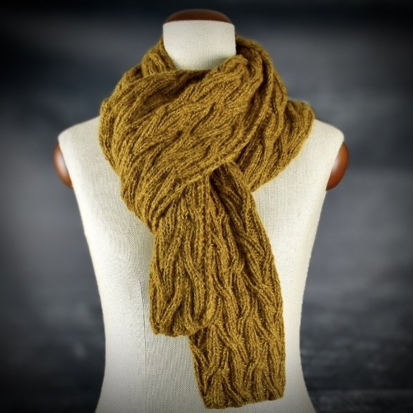 Mein Schal mißt 27 cm X 216 cm. Die Größe ist individuell anpaßbar, so daß Du ihn mit jedem Garn und in Deiner Wunschgröße nachstricken kannst.