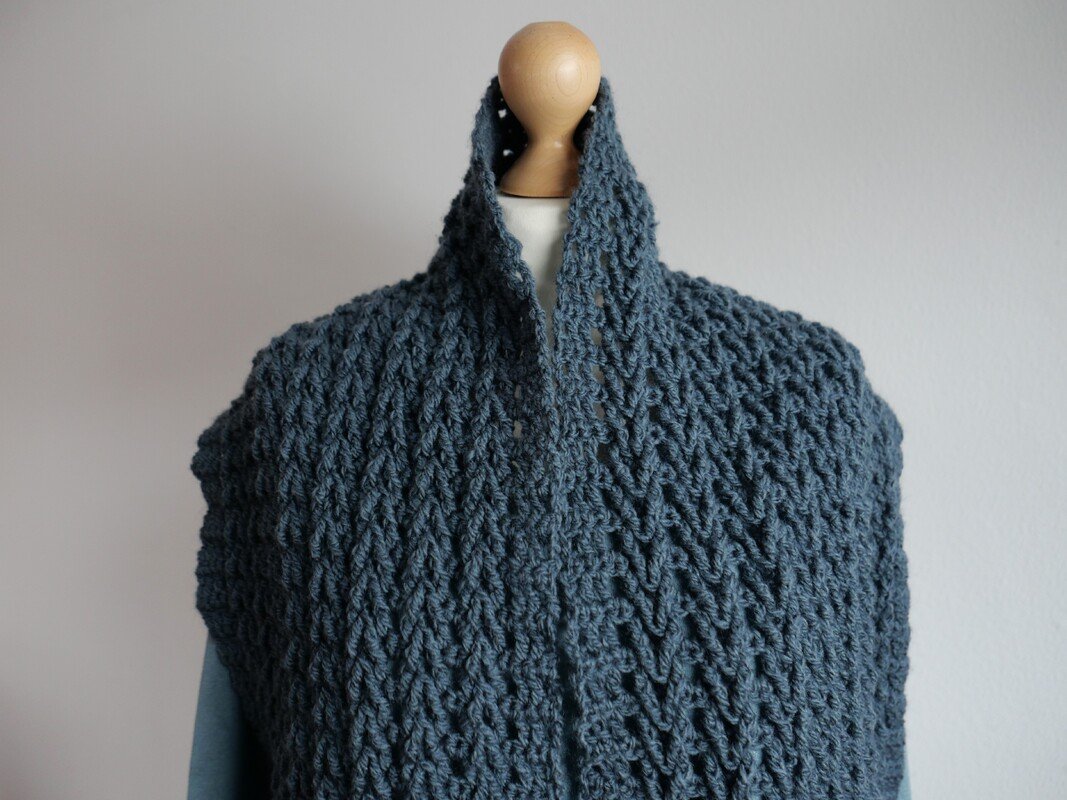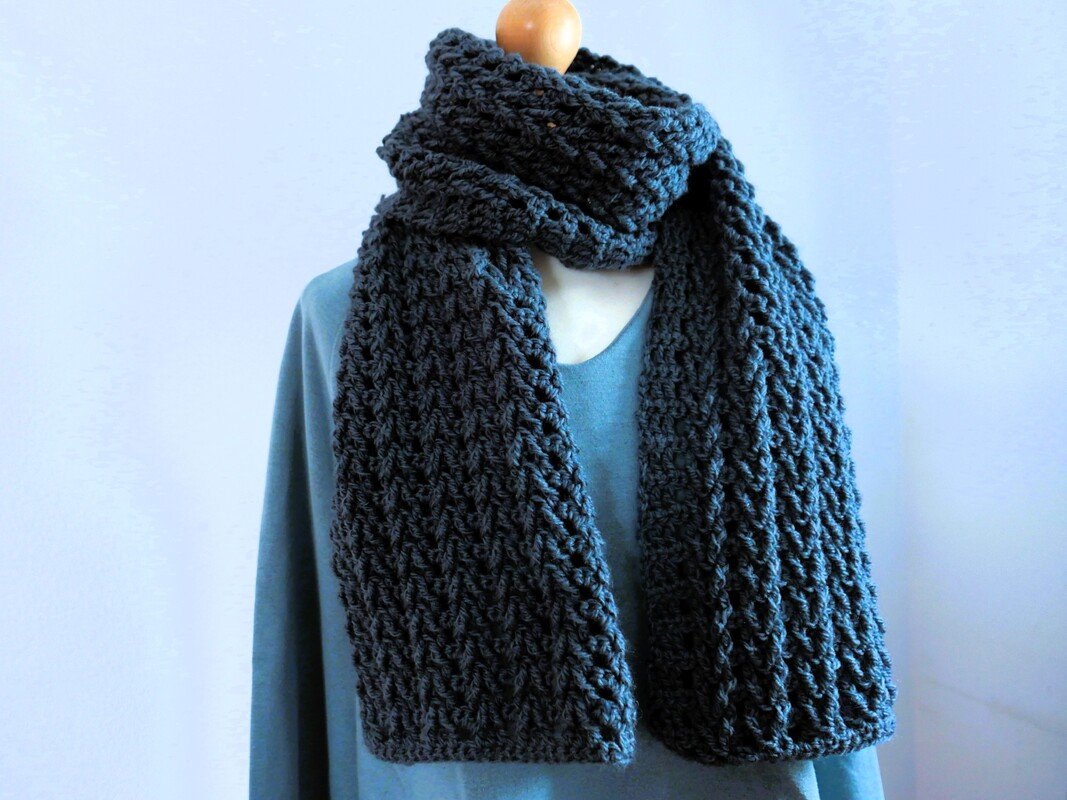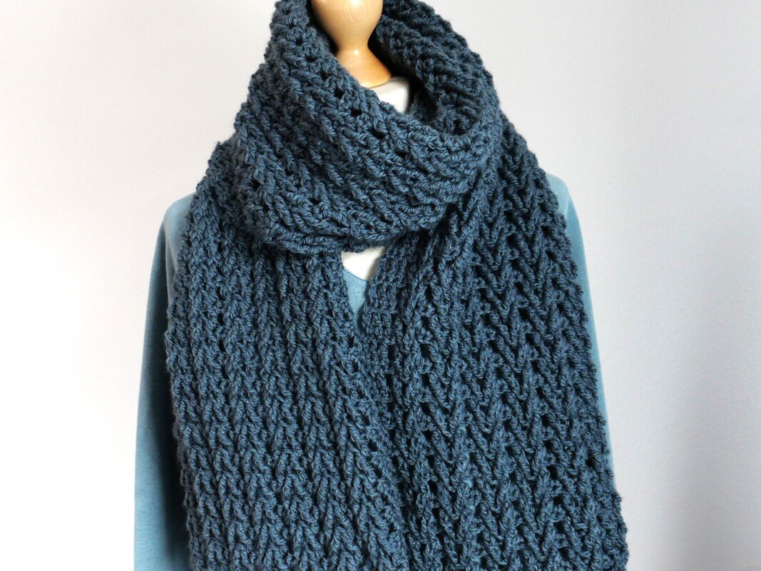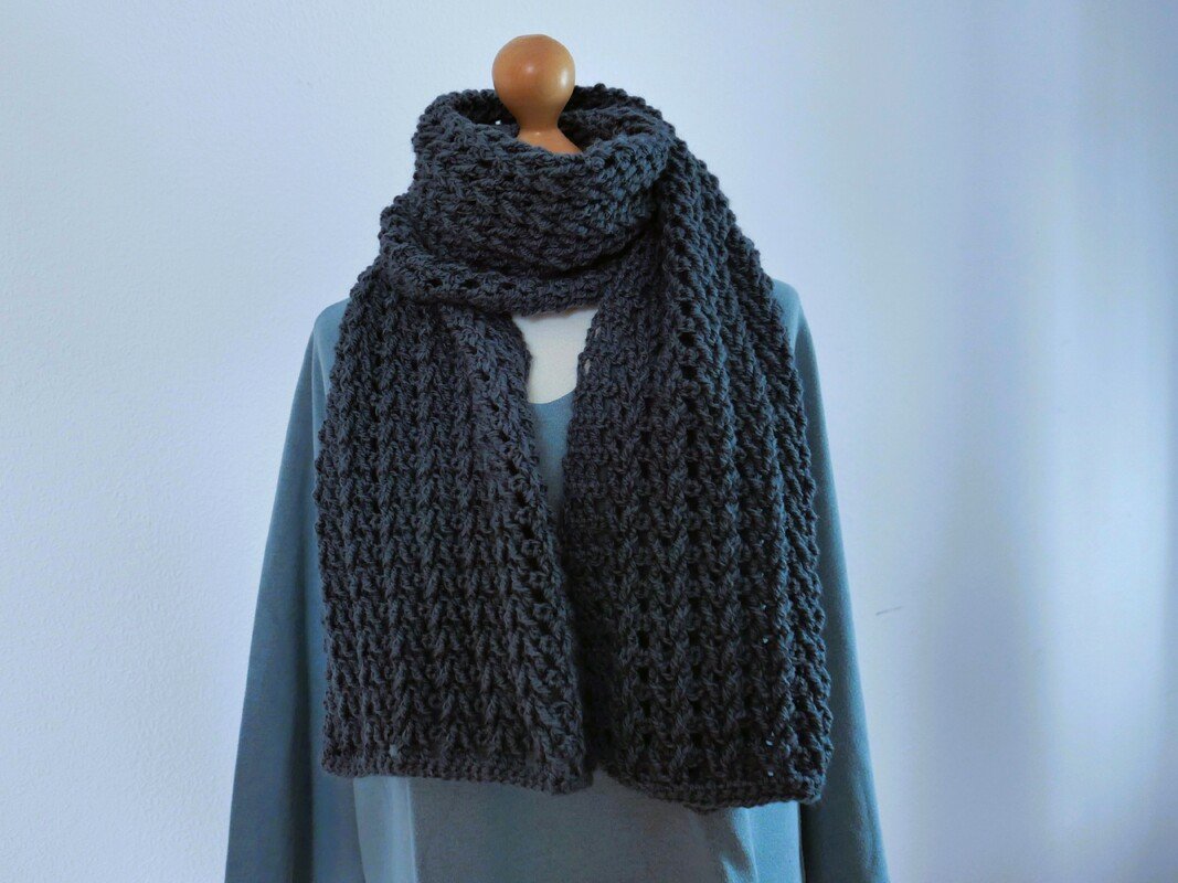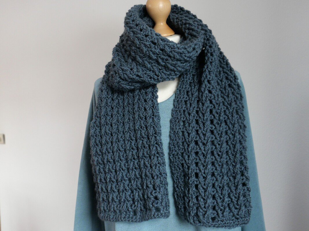 Der Schal wird in Hin- und Rückreihen gearbeitet, das zweireihige Muster wiederholt sich fortlaufend und ist gut einprägsam. Dadurch eignet sich die Anleitung sowohl für ambitionierte Anfänger:innen als auch für erfahrene Häkler:innen, die ein unkompliziertes, aber wirkungsvolles Projekt suchen.