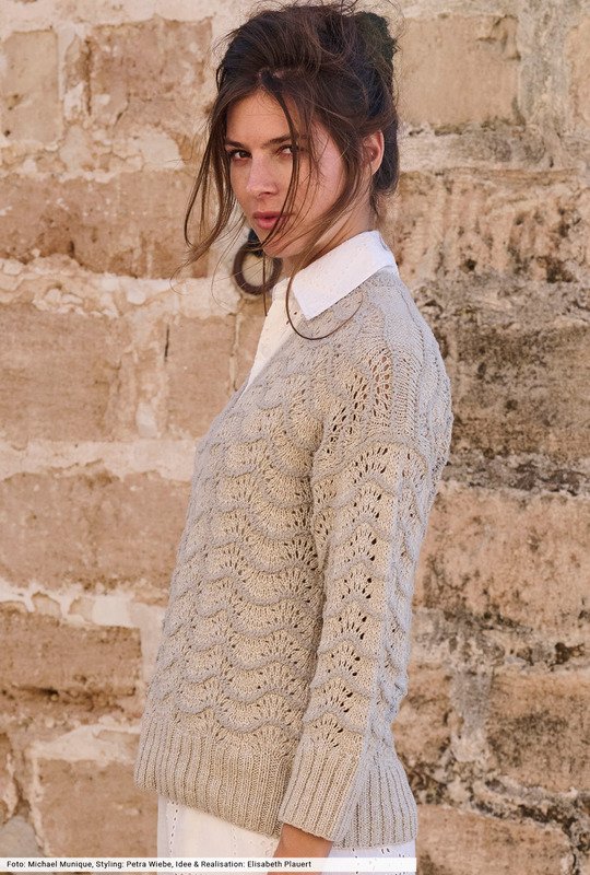 Der spannende Look wird bei diesem aparten Pullover durch den steten Wechsel von glatter Leinen-Baumwolle und plüschigem Frottéegarn erzeugt, das zusätzlich durch das Pfauenmuster Wellen schlägt. In sanften Grègetönen entsteht eine tolle Optik, die sich jedem Modestil perfekt anpasst. Das Finish bildet die schmale Glatt-rechts-Blende um den Halsausschnitt und an den Saumkanten hohe Rippenbündchen aus rechten und linken Maschen.