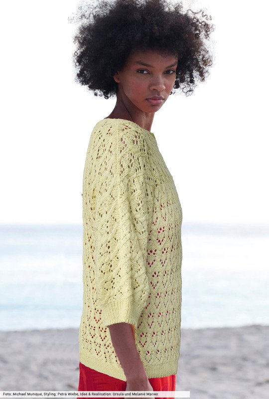 Ein Hauch von Sonne zum Anziehen: In hellem Vanillegelb treffen bei diesem saloppen Pulli luftige Zopf-Lochstrukturen auf eine entspannte Silhouette, die den Körper sanft umschmeichelt. HInzu kommen die kurzen Ärmel, die seitlich angestrickt sind – so können Sie auf das lästige Einsetzen verzichten. Weiterer Pluspunkt: Die gerade Halskante kommt ohne Blende aus, dafür halten die Rippenblende an den Saumkanten alles schön in Form.