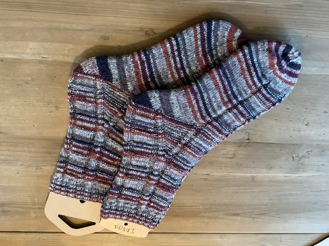 „Elea“ sind Socken mit einem kleinen Zopfmuster, das durch links gestrickte Streifen ergänzt wird. Das farbige Muster (Ringel/Streifen) kommen direkt aus dem Knäul und so sieht jede Socke anders aus. Die Socken werden von oben nach unten gestrickt. Ich habe die Ferse als Zunahmeferse gearbeitet und eine Bandspitze gestrickt und beschrieben. Ferse und Spitze können jedoch auch anders ausgeführt werden.