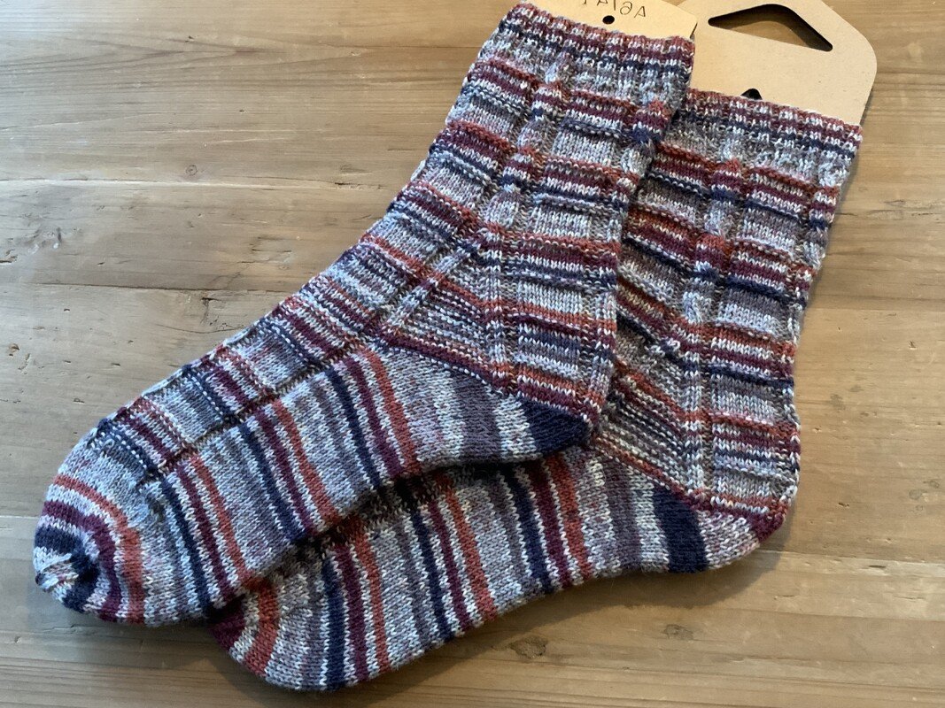 Die Mustersocken (hell), sind aus Sockenwolle von myboshi Farbe berdal, [75% Schurwolle, 25 % Polyamid],
