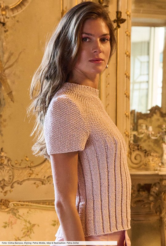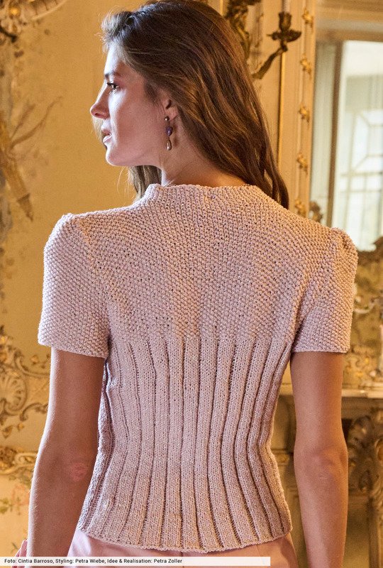 Die Masche zeigt sich hier von ihrer schimmernden Seite – mit einem Baumwollgarn, dem metallisierende Fasern hinzugefügt wurden. Ideal für Frühlingslooks, die strahlen, ohne laut zu wirken. Und auch die Musterung ist bei diesem anfängerfreundlichen Kurzarmpulli eher zurückhaltend: Elastische Rippen für das Unterteil, ab Brusthöhe und für die Puffärmel setzen sich Perlstrukturen in Szene. Der Stehkragen und die figurnahe Form sorgen für Stil und Eleganz.
