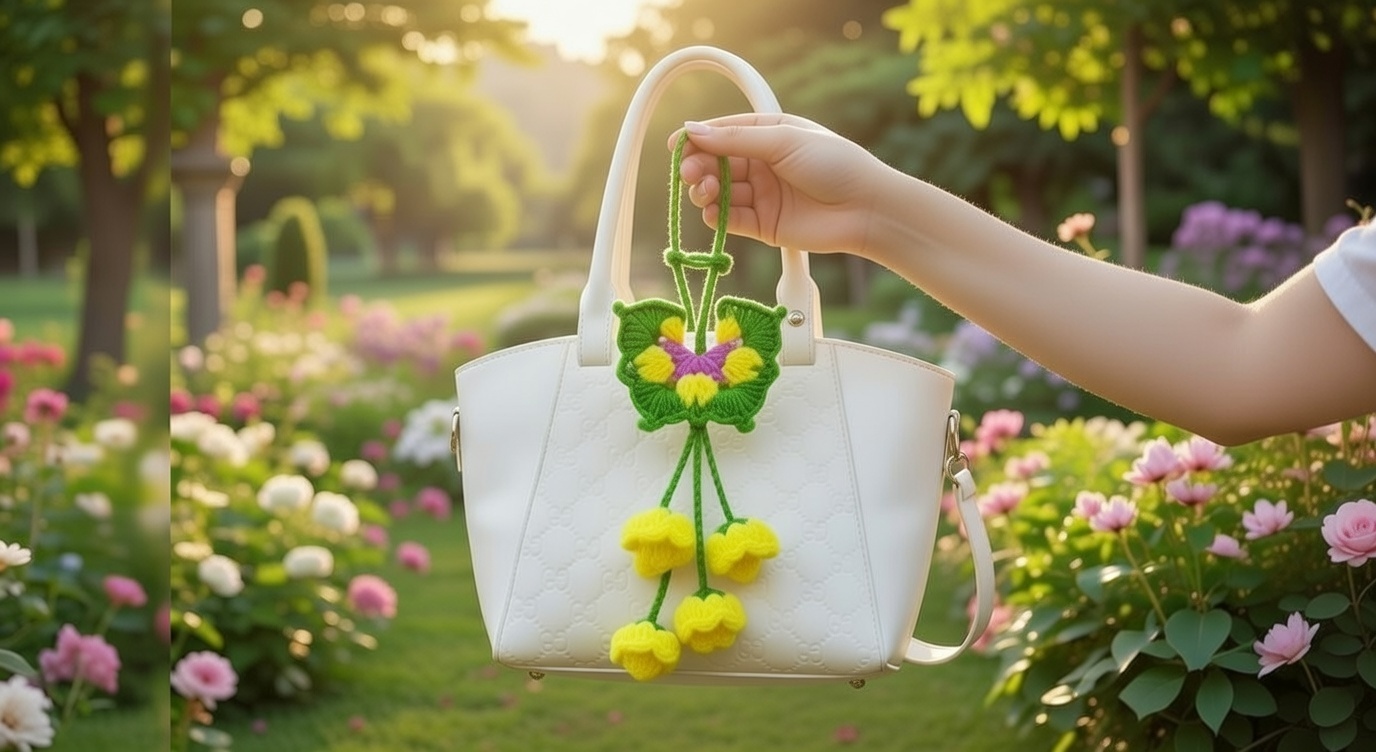 Mit dieser detaillierten Häkelanleitung kannst du eine dekorative Schmetterling & Blumen Charm Bag häkeln.