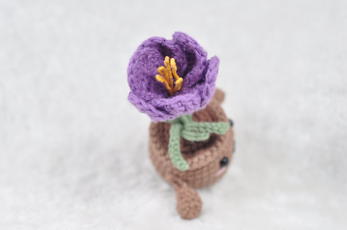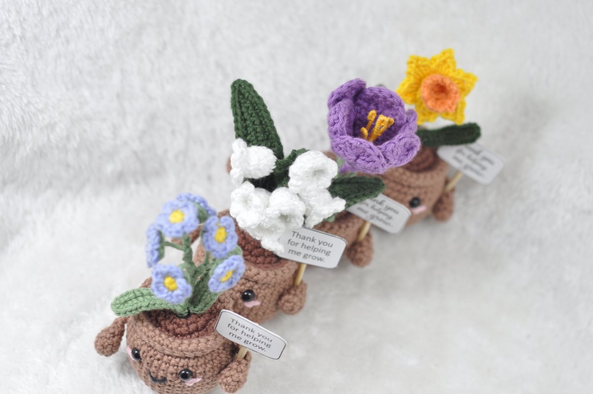 Diese liebevoll gestaltete Häkelanleitung zeigt dir Schritt für Schritt, wie du eine frühlingshafte Emotional Support Plant mit 4 Blumen häkelst: Narzisse, Maiglöckchen, Vergissmeinnicht und Krokus.