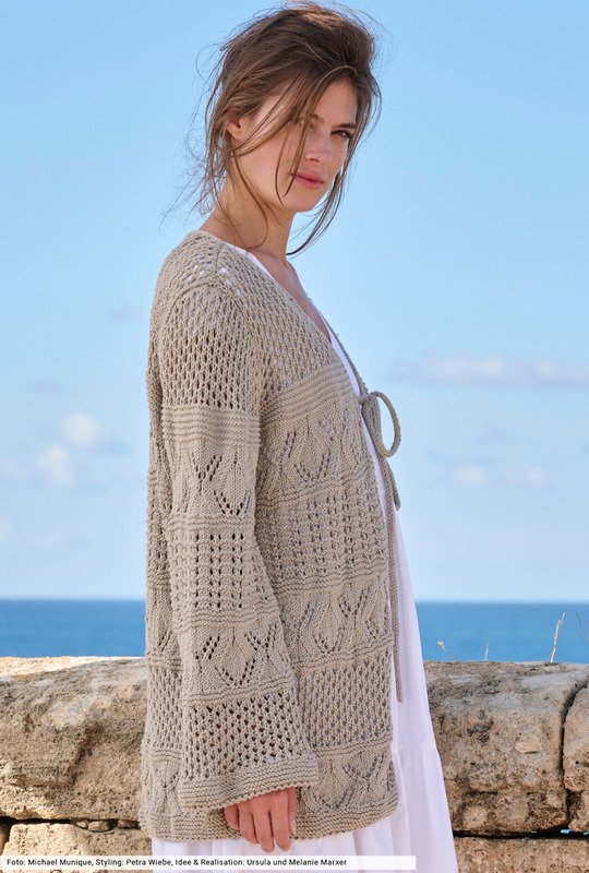 Mixtur auf hohem NIveau: Hier sorgt das spannende Zusammenspiel von Rautenstrukturen, Netzoptiken und einem Wellenmuster für Kurzweil beim Stricken. Daraus entsteht Stück für Stück eine lässige Jacke, deren Innenkanten zum Schluss in I-Cord-Technik eingefasst und mit einem Bindeband vervollständigt werden. Die fließende Silhouette mit leicht ausgestellten Ärmeln betont die Leichtigkeit des Modells, das sich durch den neutralen Beigeton jedem Stil perfekt anpasst.