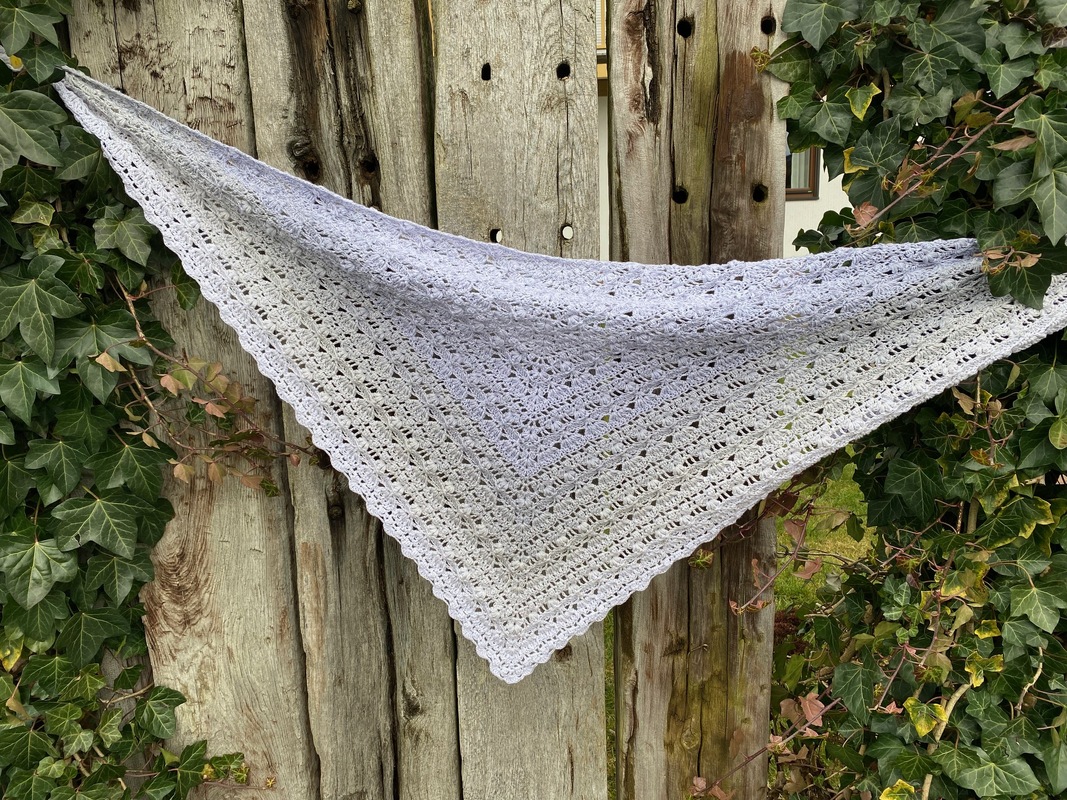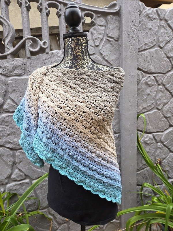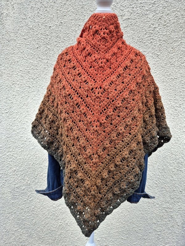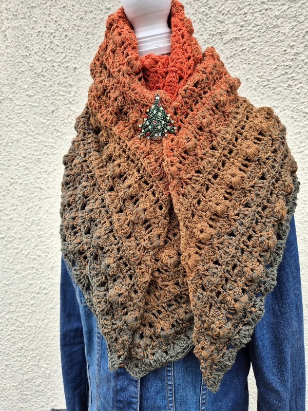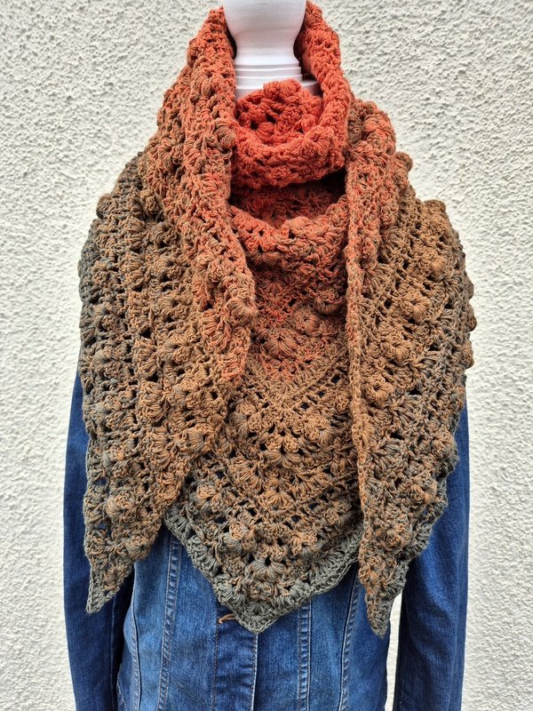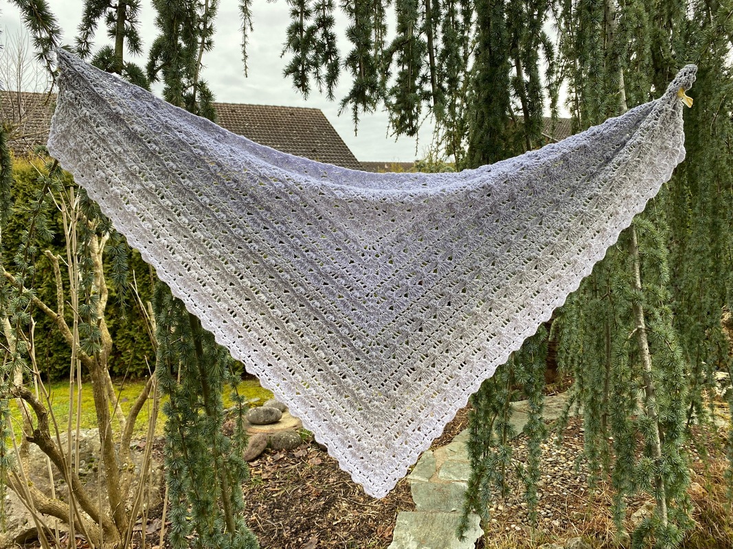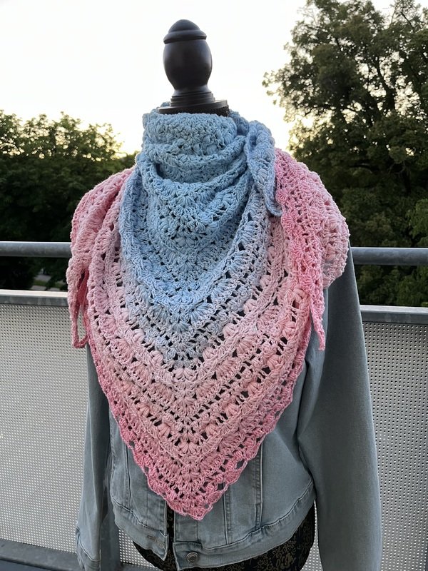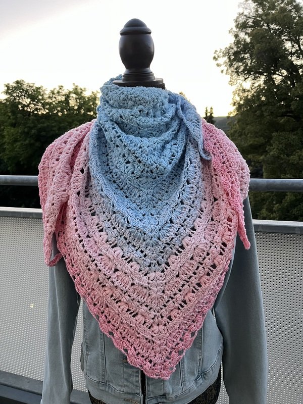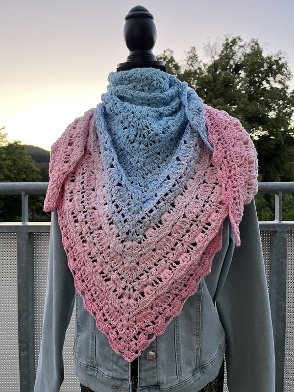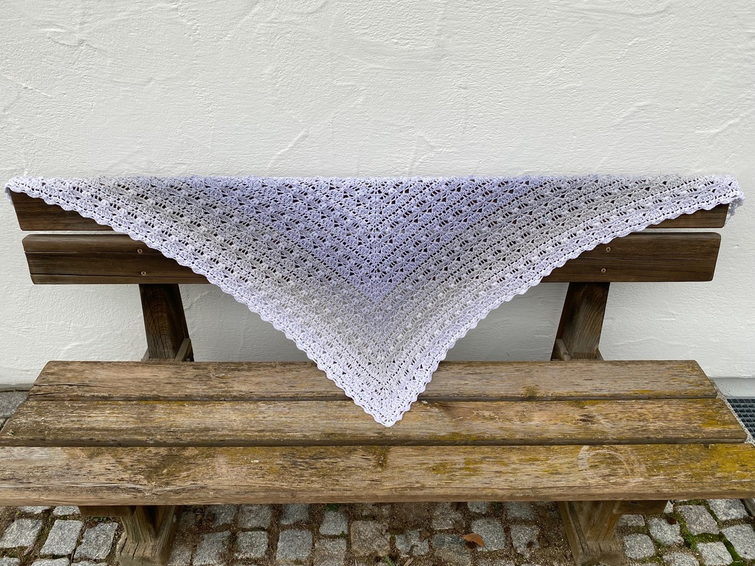 Das Tuch vom Titelbild wurde mit einem Bobbel mit 1400 m, 4-fädig und Nadelstärke 4 gehäkelt und misst ca. 200 x 75 cm.