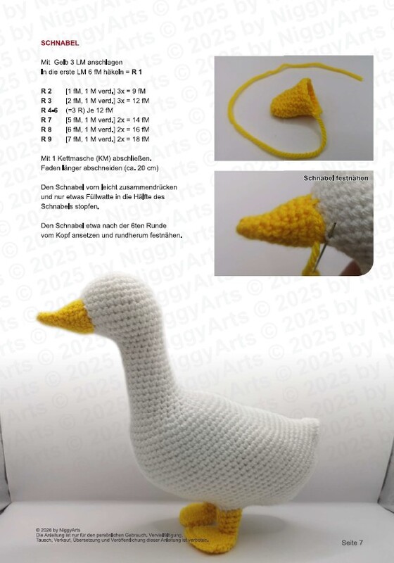 Die Beine werden direkt angehäkelt, so dass lediglich der Schnabel angenäht werden muss.