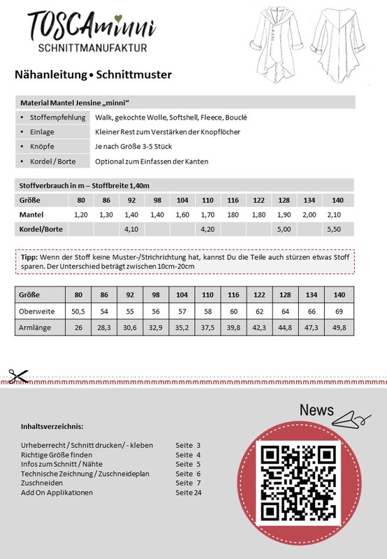 Das Schnittmuster Jensine "minni" ist die kleine Ausführung von unserem Damenmantel Jensine. Dieses Modell ist aus Walk genäht und muss nicht abgefüttert werden. Der Mantel ist daher relativ leicht zu nähen und wir würden ihn als anfängerfreundlich einstufen.