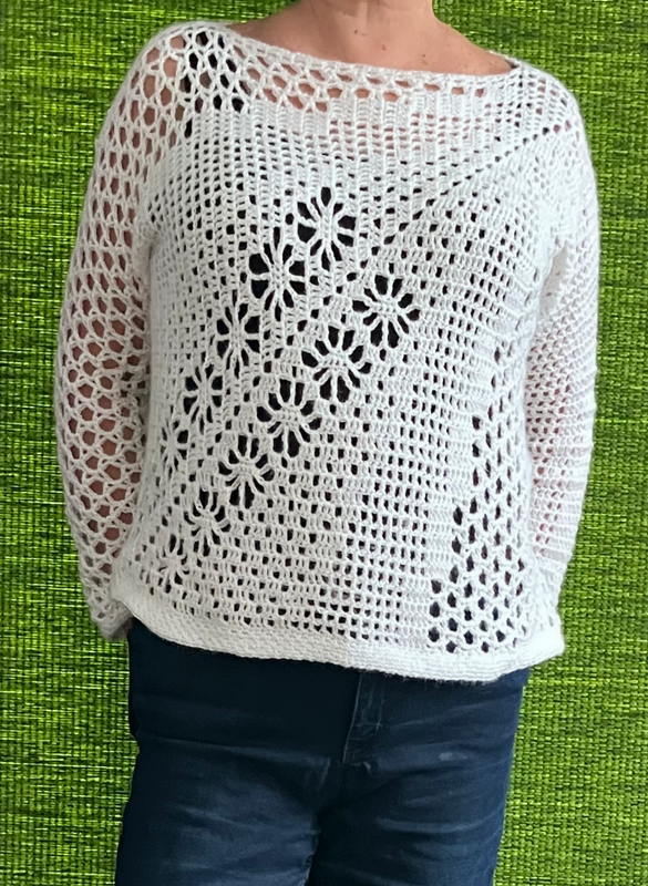 Du kannst dieses Shirt in ALLEN Größen häkeln. Du musst dich am Anfang noch nicht festlegen, da es langsam immer breiter wird. Eine Maschenprobe ist auch nicht erforderlich.