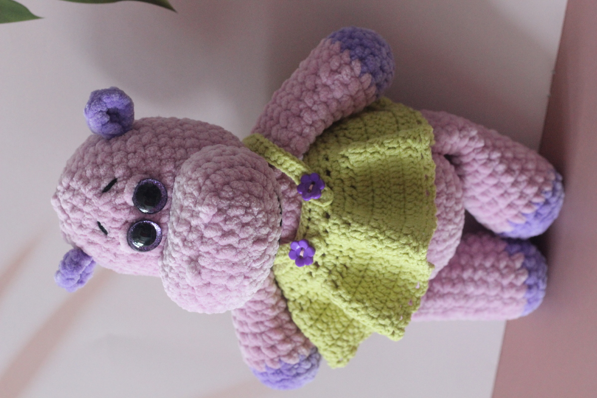 Häkelnadel 4 mm, ca 100 gr passende Wolle mit Lauflänge 120 m/ 100gr (z.B. Gründl Funny Uni oder YarnArt Dolce) in Lavendel und Lila, ca 20 gr YarnArt Jeans und Häkelnadel 2,5 mm für die Hosen, Material zum Füllen, Sicherheitsaugen 15 mm, Schere, Sicherheitsnase, Stopfnadel