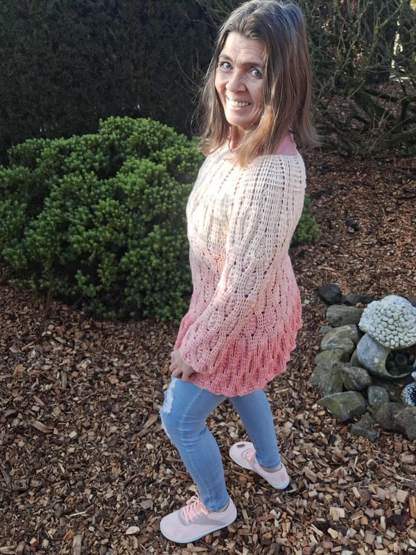 Er wird in einem Stück von oben nach unten gearbeitet, die Ärmel werden direkt angehäkelt.