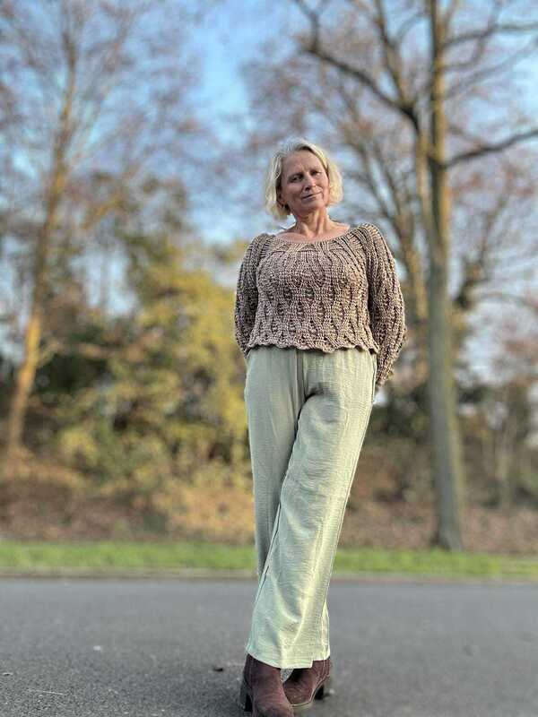 Es ist sowohl möglich, ihn ganz gerade zu häkeln, es können aber auch Zunahmen nach Wunsch getätigt werden, um ihn leicht ausgestellt oder mit glockigem Abschluß zu fertigen.