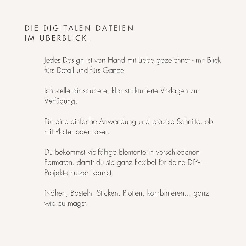 Die handgezeichneten Plotter- und Laserdaten bieten dir außergewöhnliche Designs, die deine kreativen Projekte bereichern. Mit klaren, natürlichen Motiven, die perfekt aufeinander abgestimmt sind, eignen sie sich hervorragend für individuelle Geschenke, Dekorationen und Bastelideen. Lade dir die Datei herunter und erschaffe einzigartige, selbstgemachte Kunstwerke!