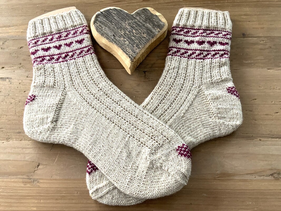 Die Grundlagen des Sockenstrickens und auch vom Fair-Isle Stricken sollten bekannt sein. Für die Fair-Isle-Herz-Muster sind Charts enthalten
