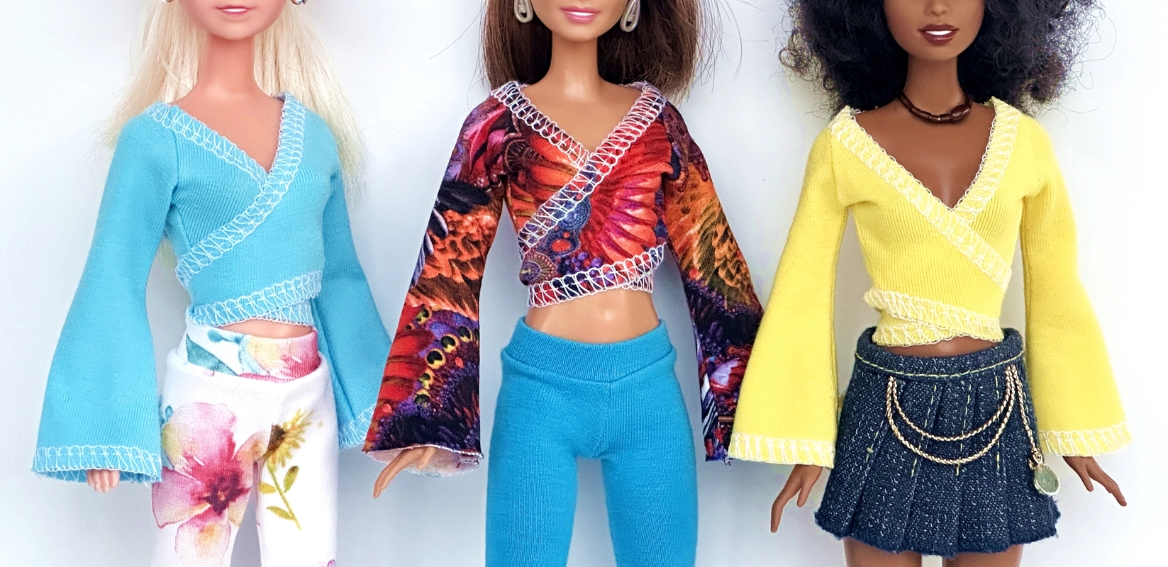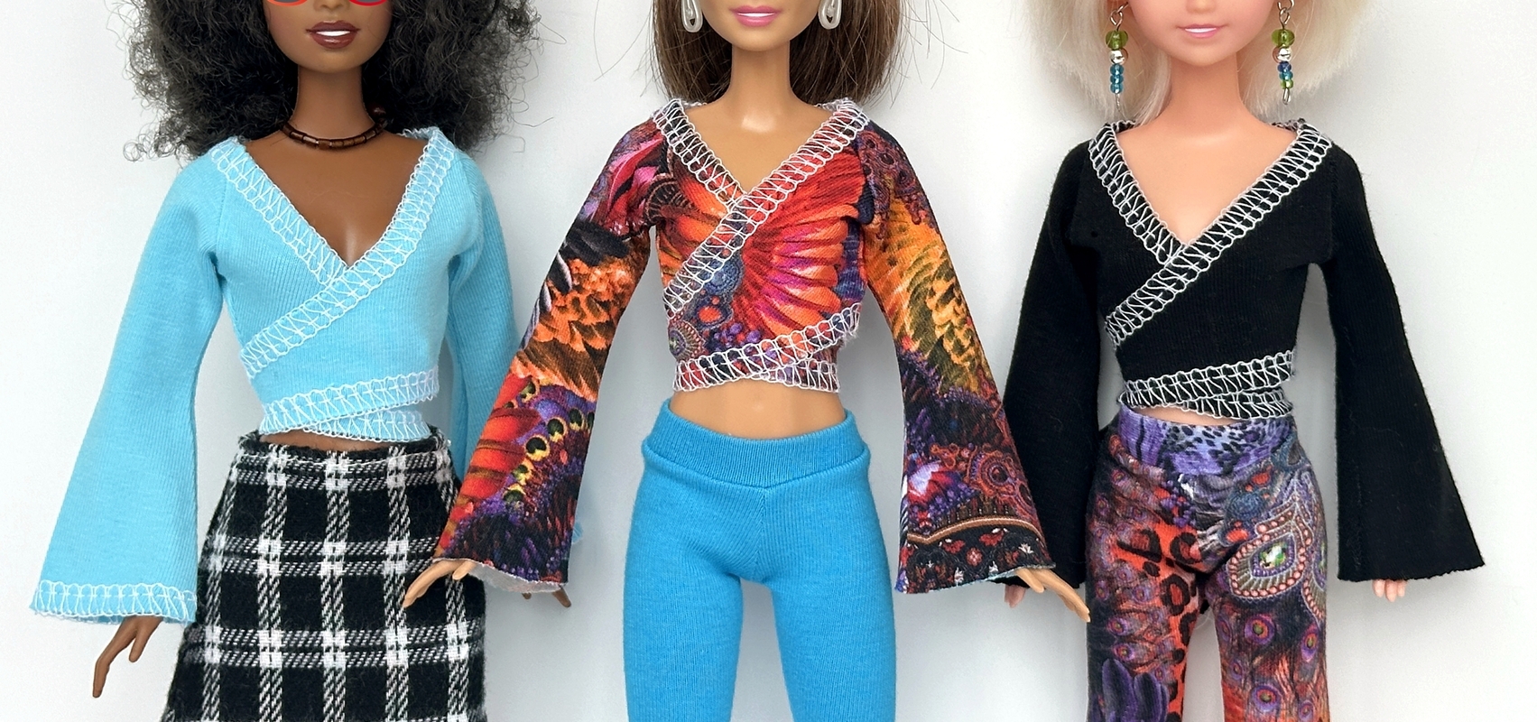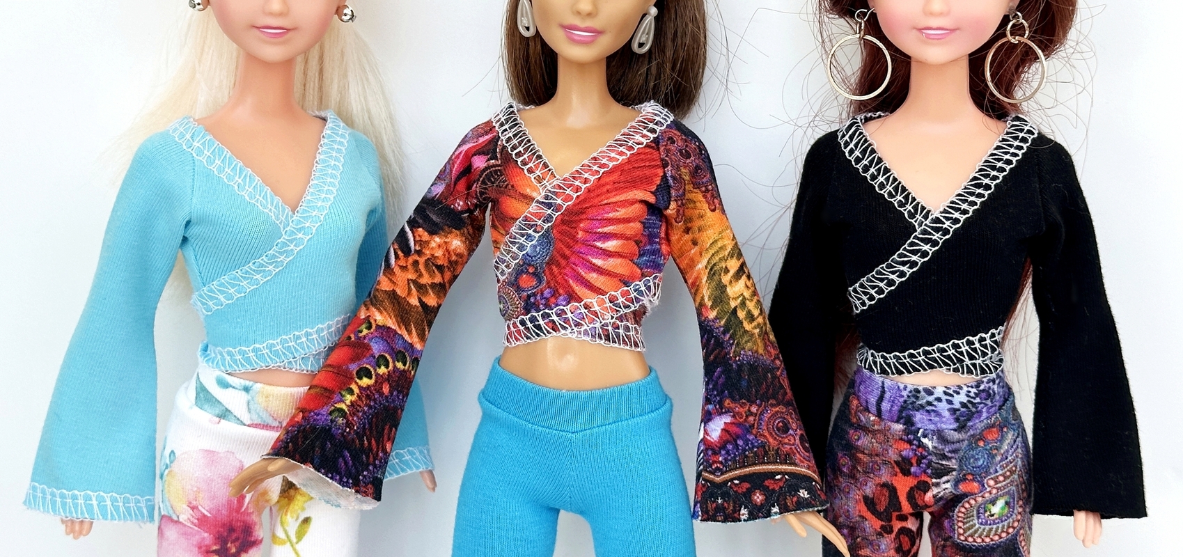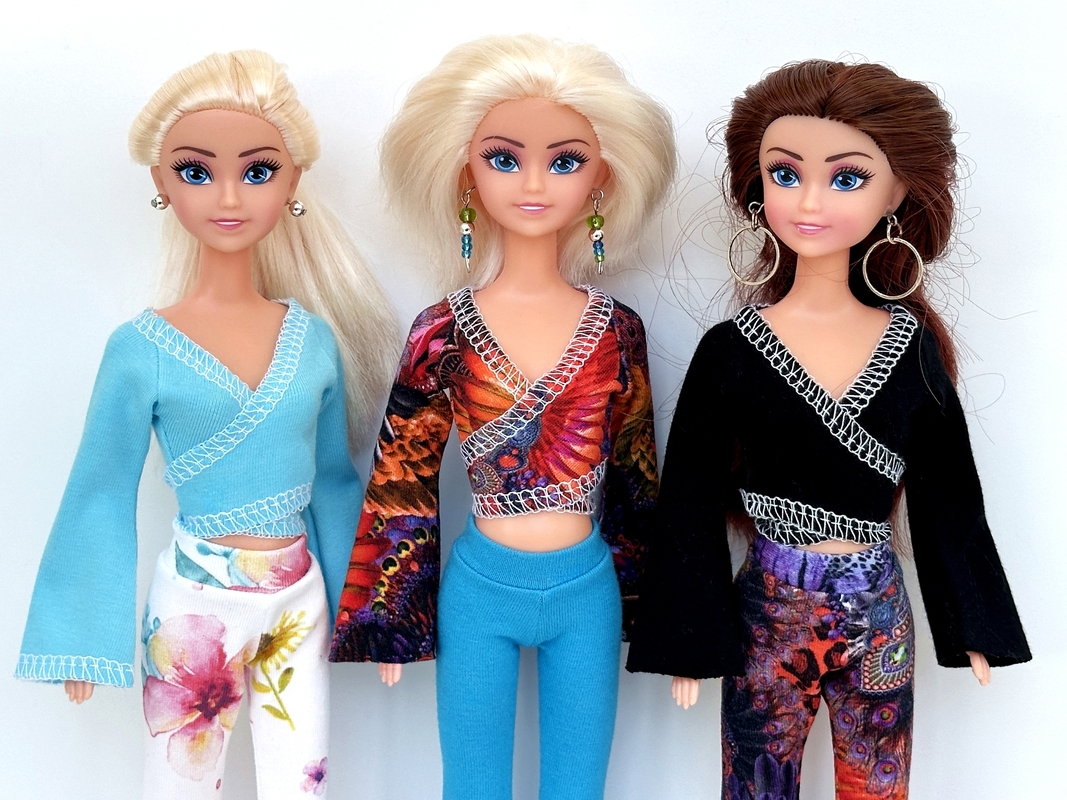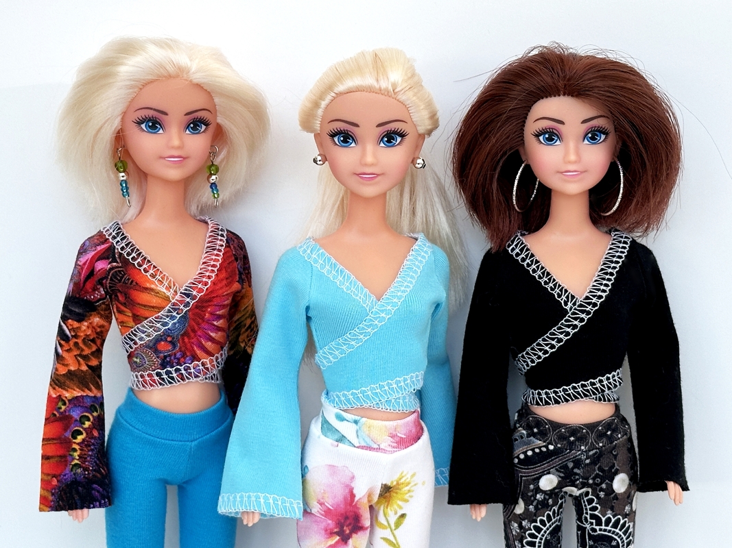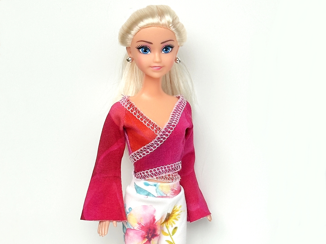 Das Wickelshirt passt allen kleinen (bekannten und weniger bekannten) Modepuppen dieser Art, die ca. 29 bis 30 cm groß sind. Das Wickelshirt kann individuell an die Figur der Puppe angepasst werden. Es wird vorn überkreuzt und hinten mit einem Doppelknoten geschlossen. Das bekommen Kinder gut alleine an- und ausgezogen. Die Ärmel können entweder auf eine feste Länge versäubert oder passend auf die individuelle Armlänge der Puppe zugeschnitten werden. Die Puppensachen sind nicht für Kinder unter 3 Jahren geeignet, da sie verschluckbare Kleinteile enthalten.