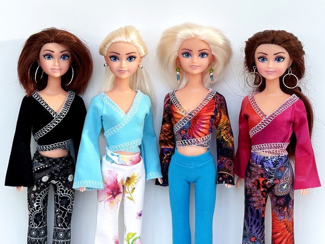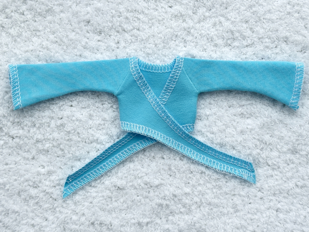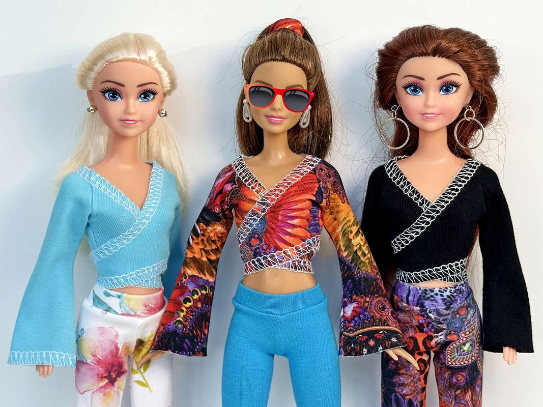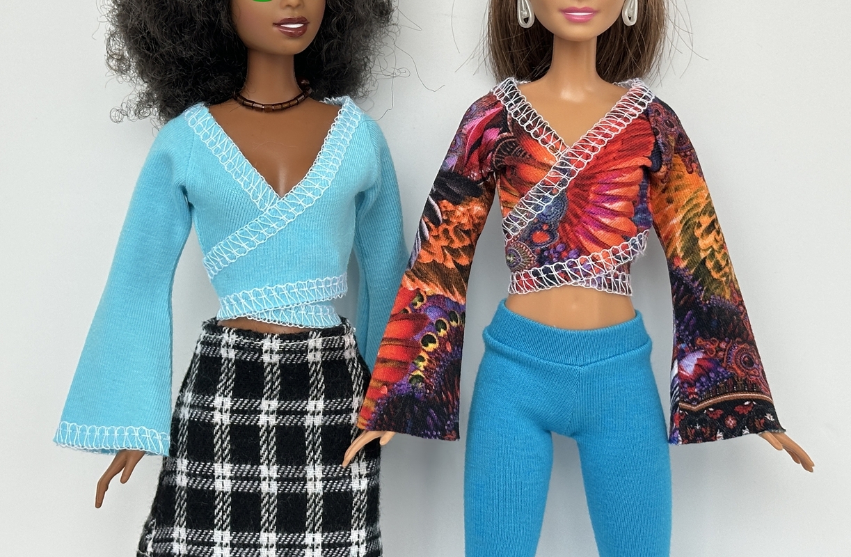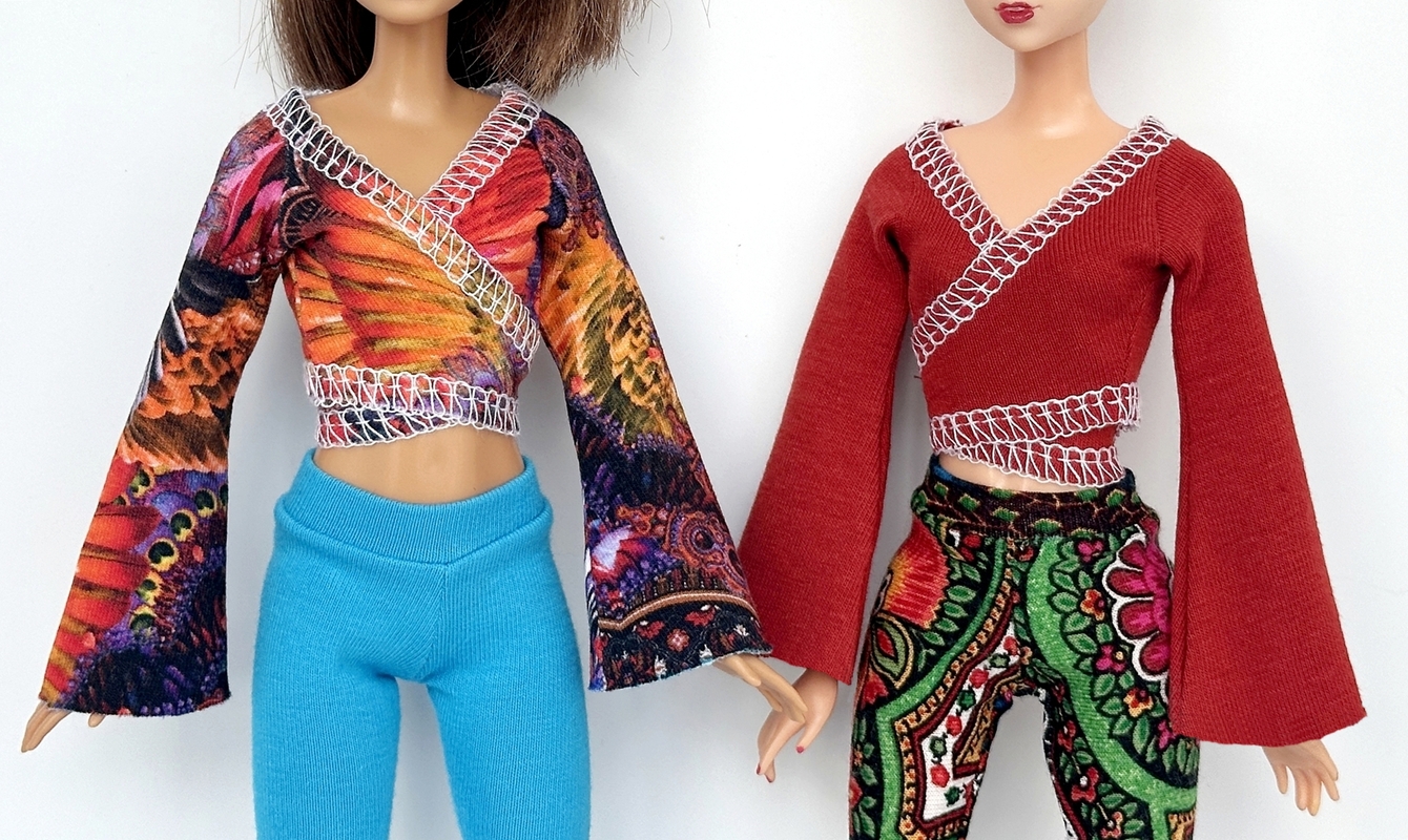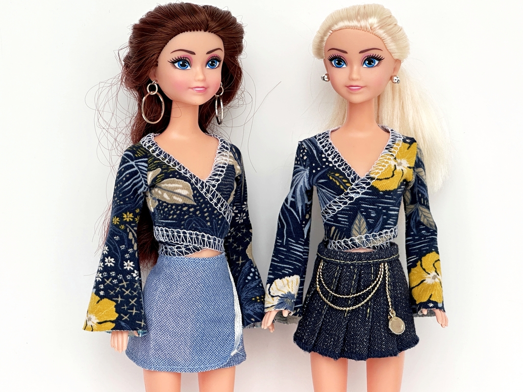 Das Wickelshirt passt allen kleinen (bekannten und weniger bekannten) Modepuppen dieser Art, die ca. 29 bis 30 cm groß sind. Das Wickelshirt kann individuell an die Figur der Puppe angepasst werden. Es wird vorn überkreuzt und hinten mit einem Doppelknoten geschlossen. Das bekommen Kinder gut alleine an- und ausgezogen. Die Ärmel können entweder auf eine feste Länge versäubert oder passend auf die individuelle Armlänge der Puppe zugeschnitten werden. Die Puppensachen sind nicht für Kinder unter 3 Jahren geeignet, da sie verschluckbare Kleinteile enthalten.