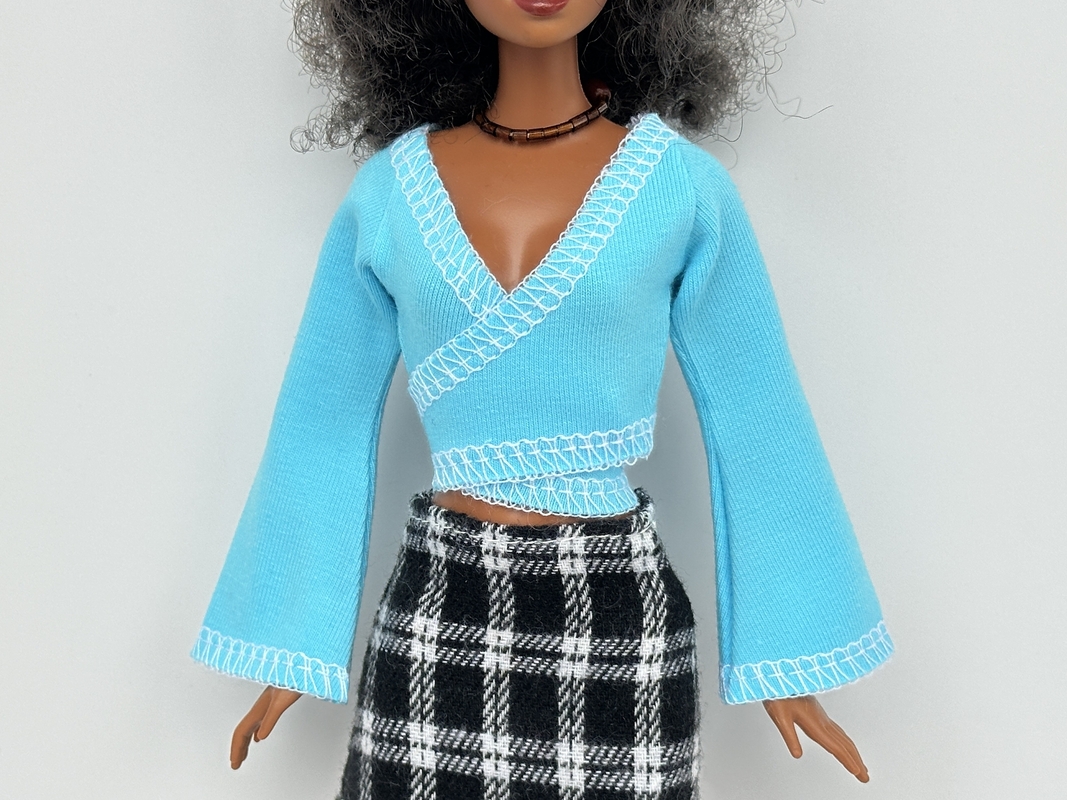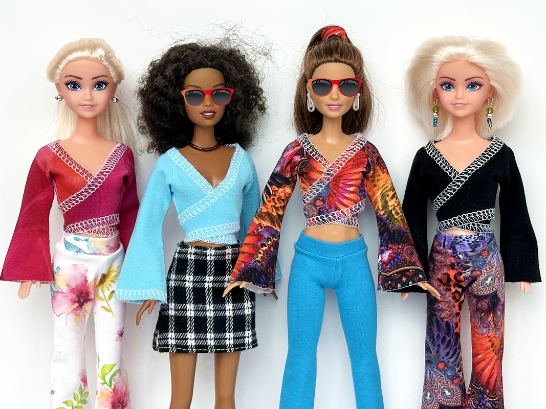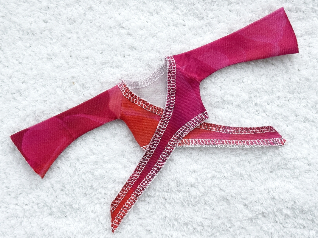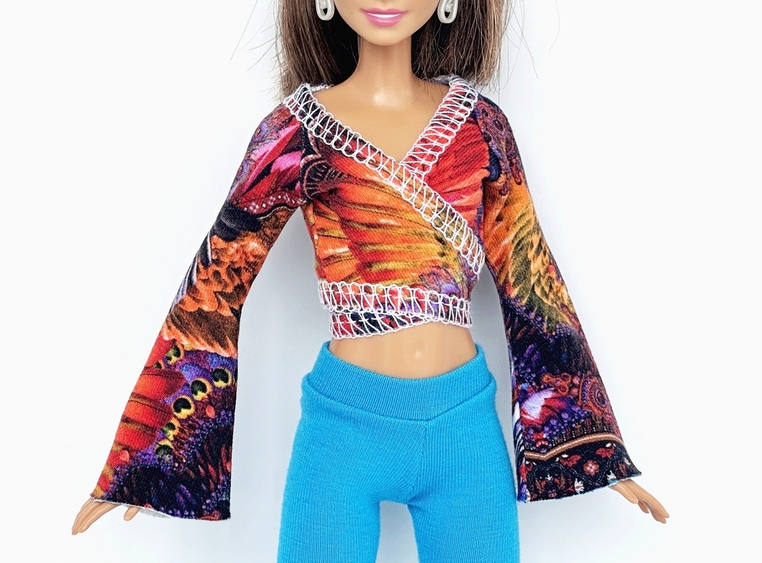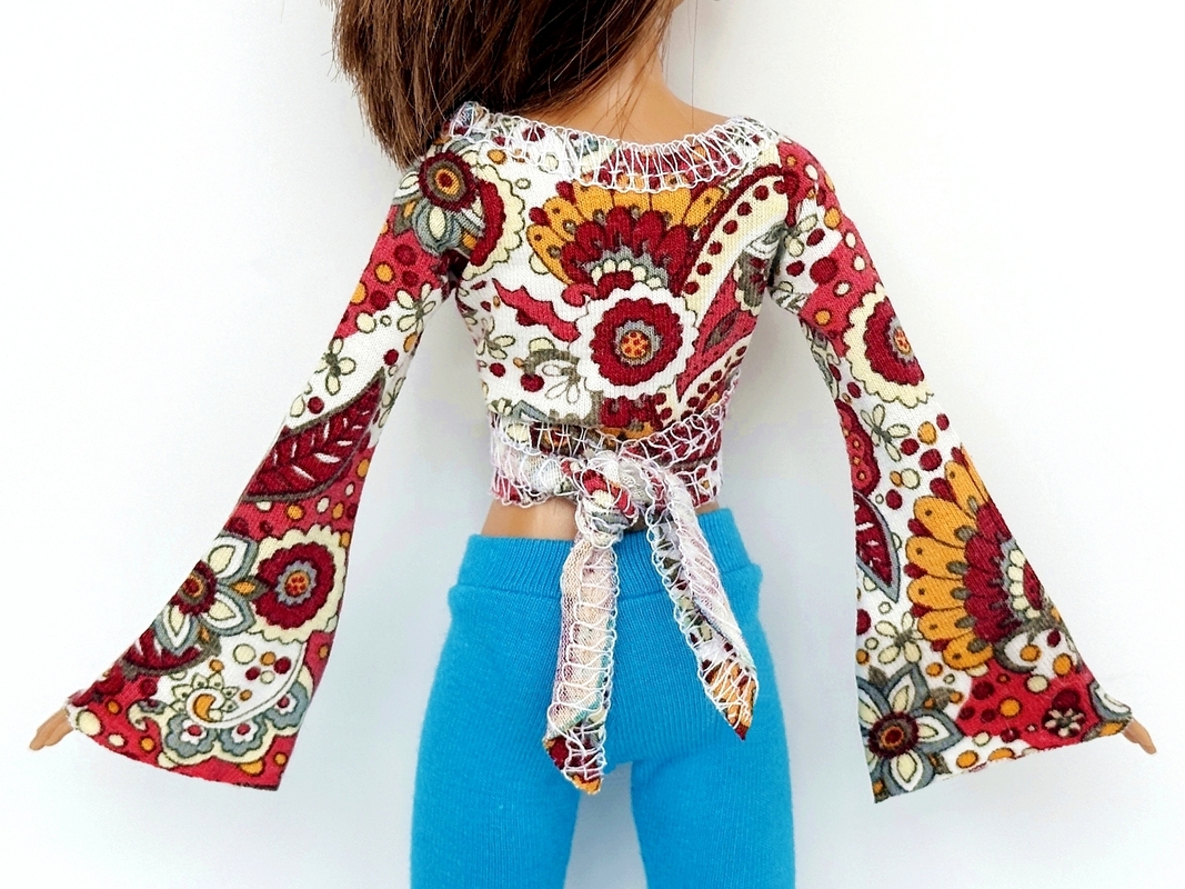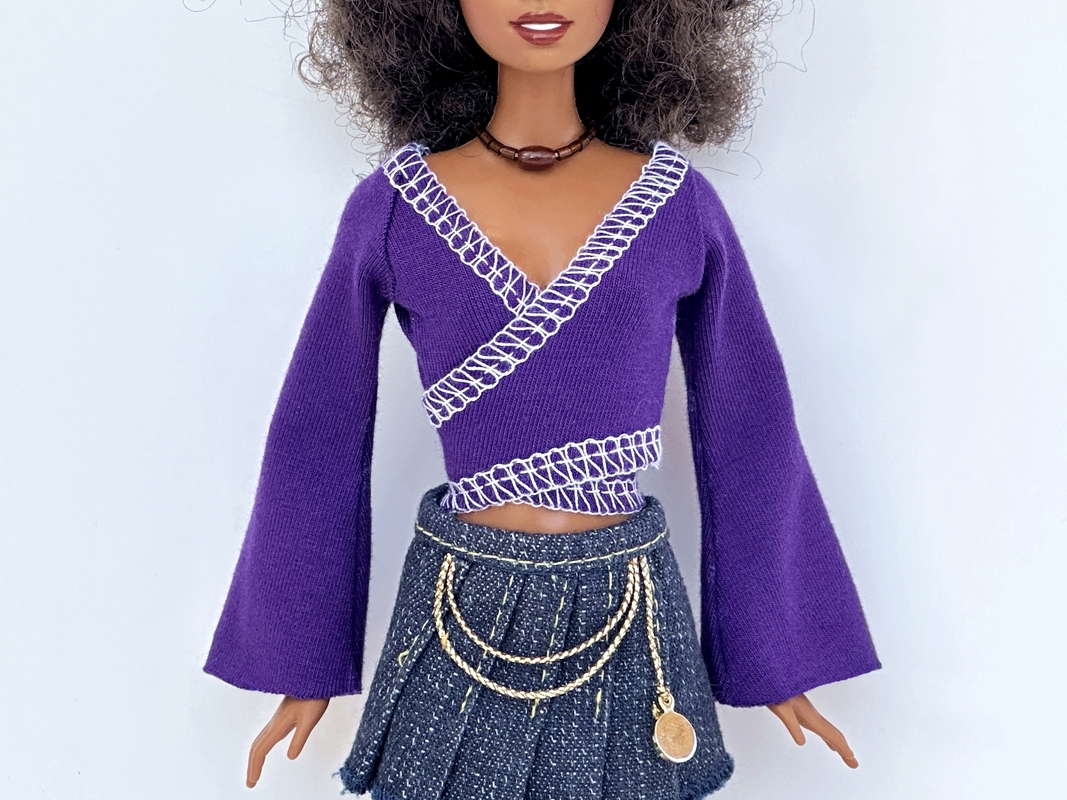 Das Wickelshirt passt allen kleinen (bekannten und weniger bekannten) Modepuppen dieser Art, die ca. 29 bis 30 cm groß sind. Das Wickelshirt kann individuell an die Figur der Puppe angepasst werden. Es wird vorn überkreuzt und hinten mit einem Doppelknoten geschlossen. Das bekommen Kinder gut alleine an- und ausgezogen. Die Ärmel können entweder auf eine feste Länge versäubert oder passend auf die individuelle Armlänge der Puppe zugeschnitten werden. Die Puppensachen sind nicht für Kinder unter 3 Jahren geeignet, da sie verschluckbare Kleinteile enthalten.
