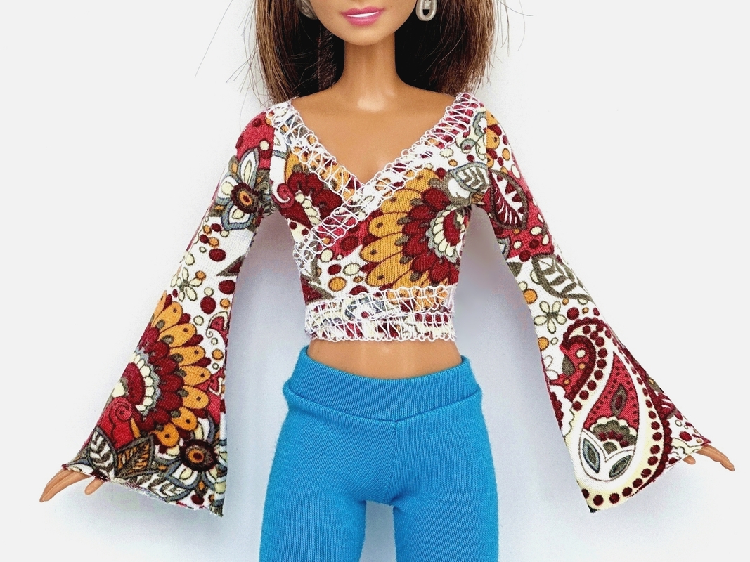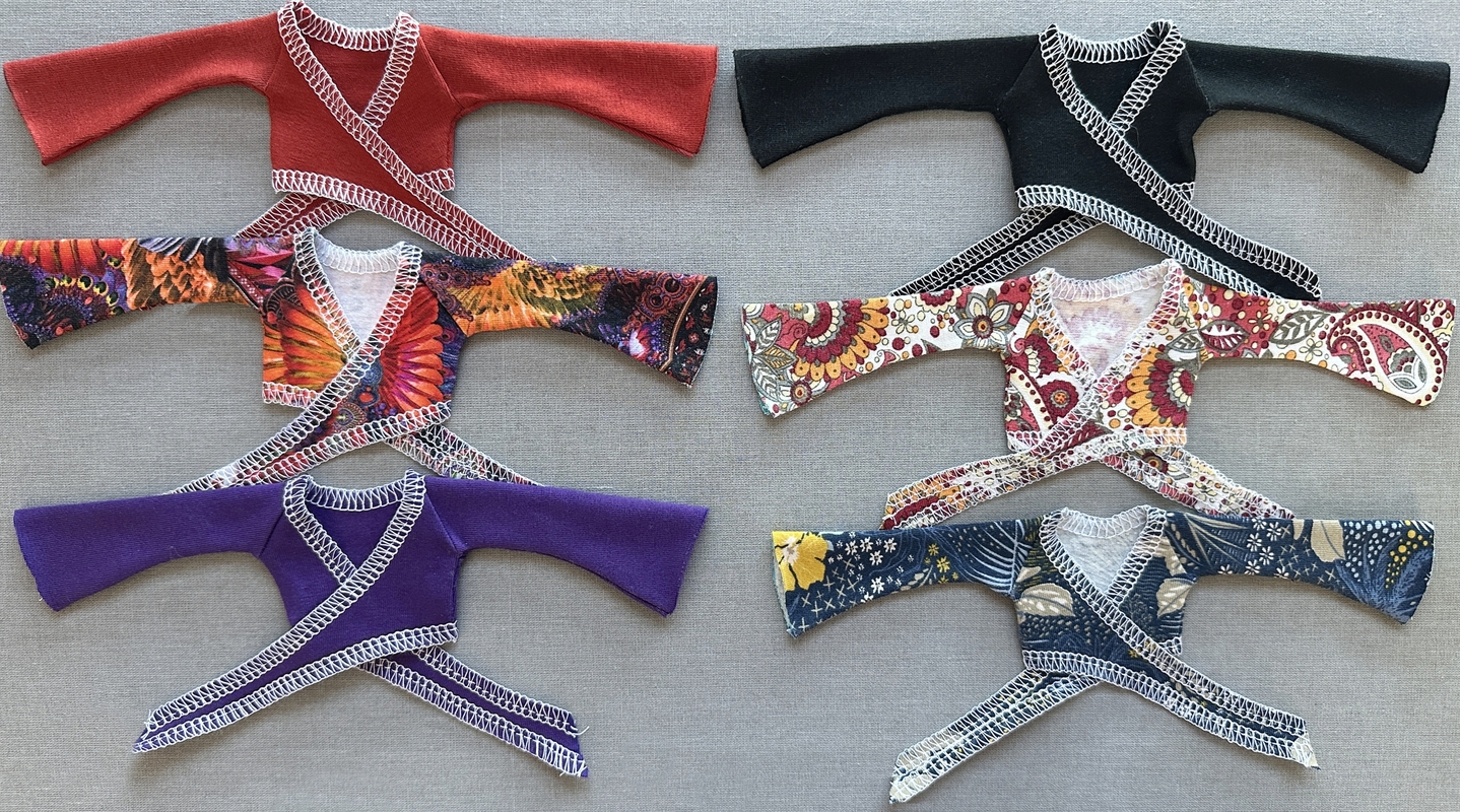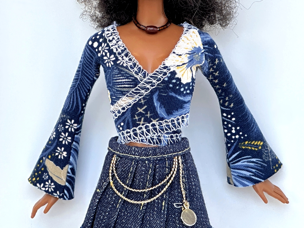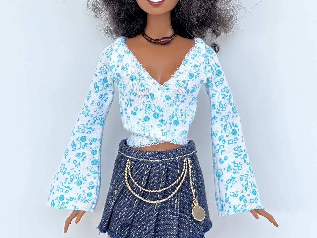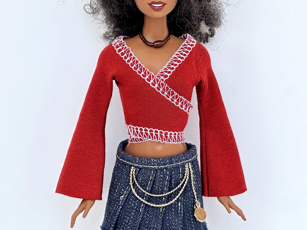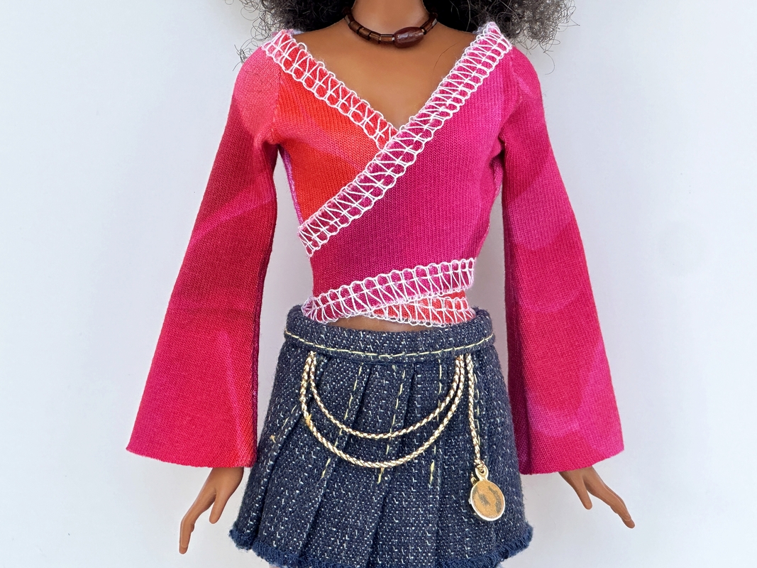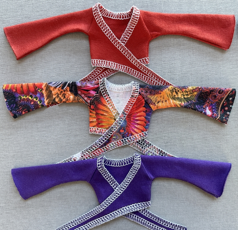Das Wickelshirt passt allen kleinen (bekannten und weniger bekannten) Modepuppen dieser Art, die ca. 29 bis 30 cm groß sind. Das Wickelshirt kann individuell an die Figur der Puppe angepasst werden. Es wird vorn überkreuzt und hinten mit einem Doppelknoten geschlossen. Das bekommen Kinder gut alleine an- und ausgezogen. Die Ärmel können entweder auf eine feste Länge versäubert oder passend auf die individuelle Armlänge der Puppe zugeschnitten werden. Die Puppensachen sind nicht für Kinder unter 3 Jahren geeignet, da sie verschluckbare Kleinteile enthalten.