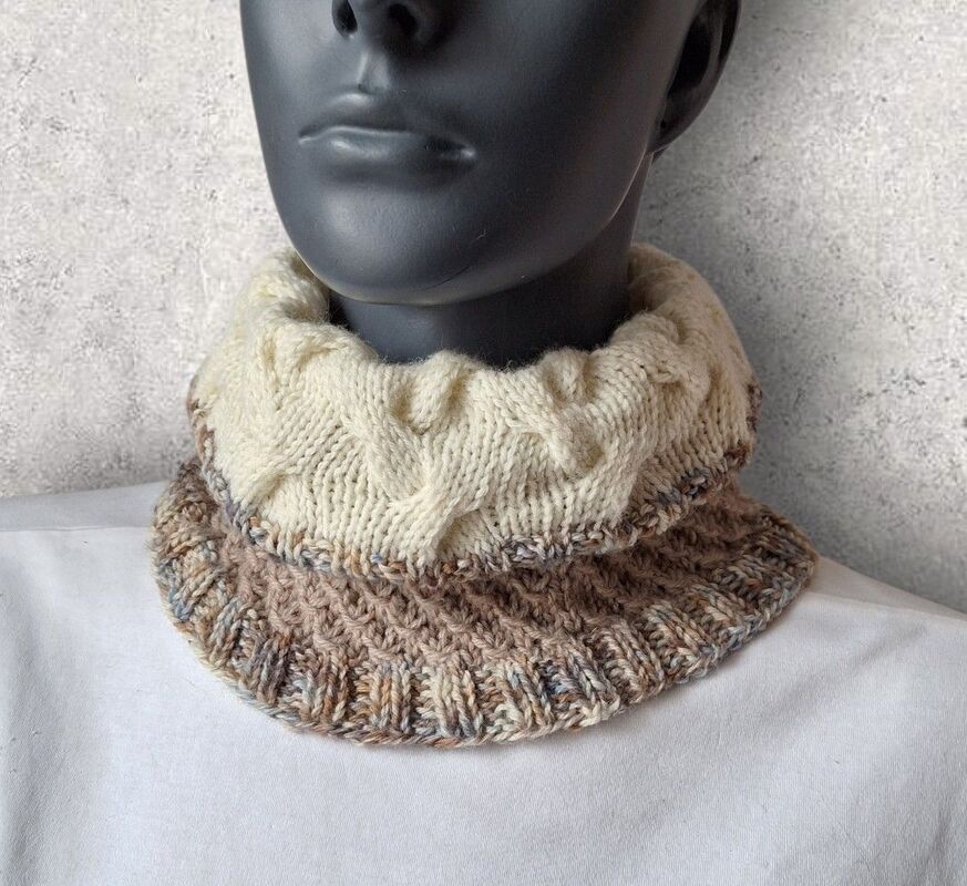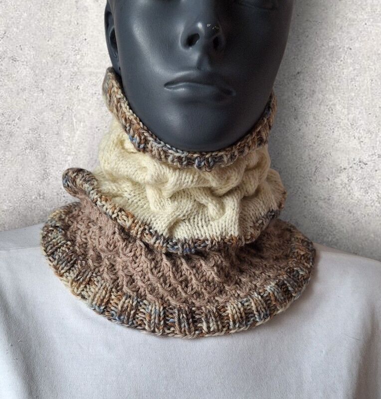 Tragbar entweder als Schlauchschal oder einmal zusammengefaltet als doppelseitige warme Halssocke. Die beiden aufeinander abgestimmten Mustersätze können je nach Vorliebe gewendet werden und bieten Abwechslung. Auch das Stricken mit unterschiedlichen Mustern lässt keine Langeweile aufkommen.