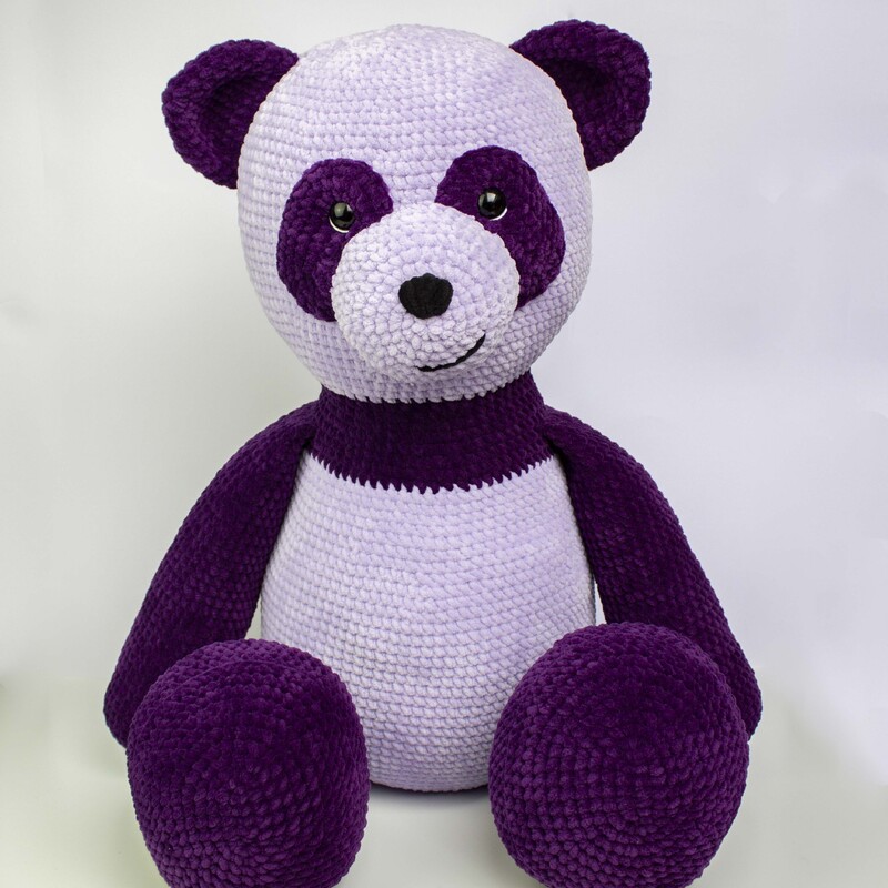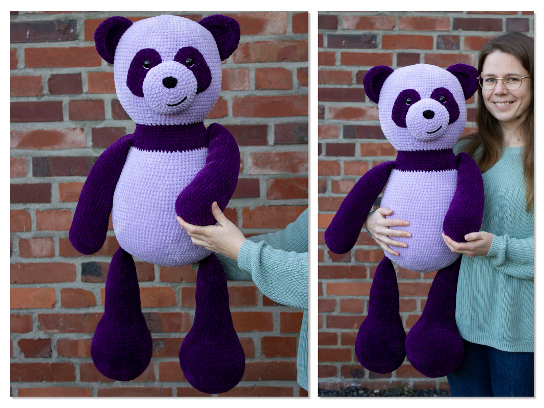 Mit Chenillegarn (120m/100g) wird der Panda im Sitzen ca. 55cm und im Stehen ca. 85cm groß. Die Größe kann allerdings, vor allem bei Chenillegarn, stark abweichen.