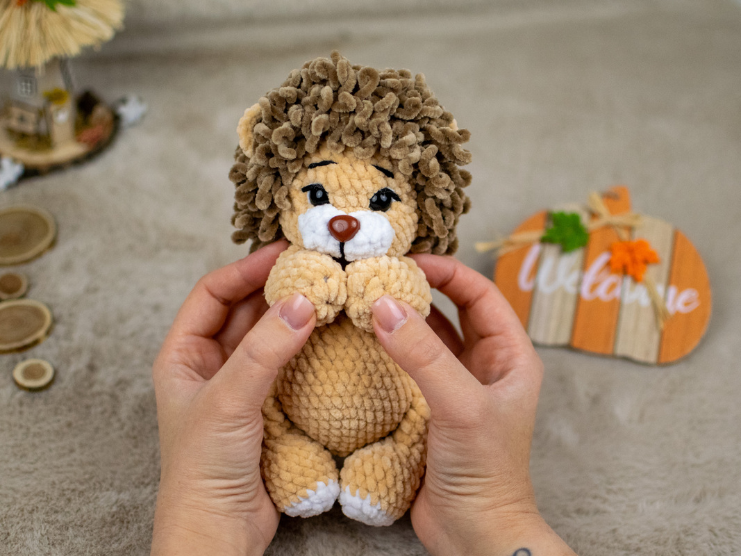 Der Löwenjunge hat eine flauschige Mähne aus Chenillegarn und eignet sich perfekt als weiches Kuscheltier.